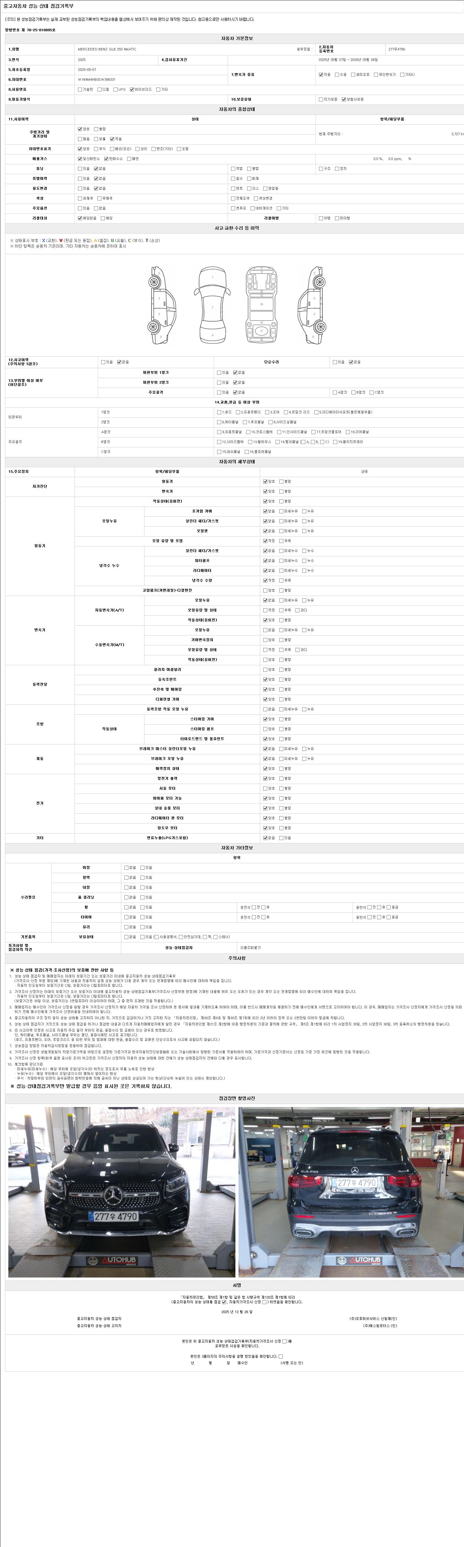 자동차관리법 시행규칙 제120조의 규정에 따라 별지 제 82호서식 《중고자동차 성능, 상태점검 기록부》를 발행한 성능, 상태점검자 및 매매자는 아래의 보증기간 또는 보증거리 이내의 중고자동차, 성능점검 기록부에 기재된 내용과 자동차의 실제 성능, 상태가 다른 경우 계약 또는 관계법령에 따라 매수인에 대하여 책임을 집니다.
