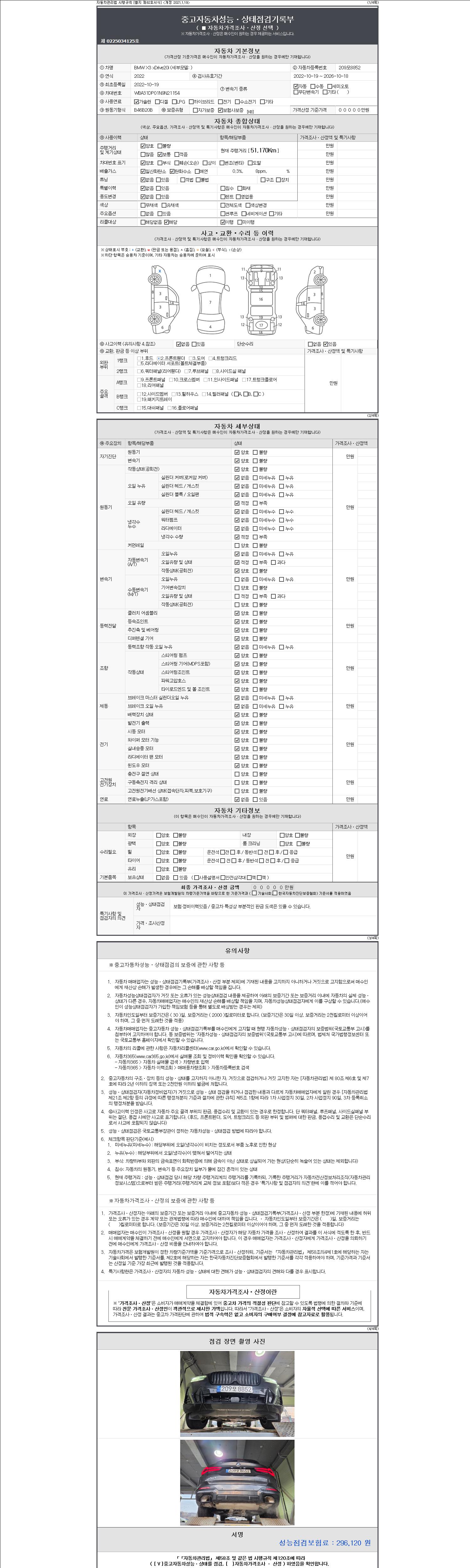 자동차관리법 시행규칙 제120조의 규정에 따라 별지 제 82호서식 《중고자동차 성능, 상태점검 기록부》를 발행한 성능, 상태점검자 및 매매자는 아래의 보증기간 또는 보증거리 이내의 중고자동차, 성능점검 기록부에 기재된 내용과 자동차의 실제 성능, 상태가 다른 경우 계약 또는 관계법령에 따라 매수인에 대하여 책임을 집니다.