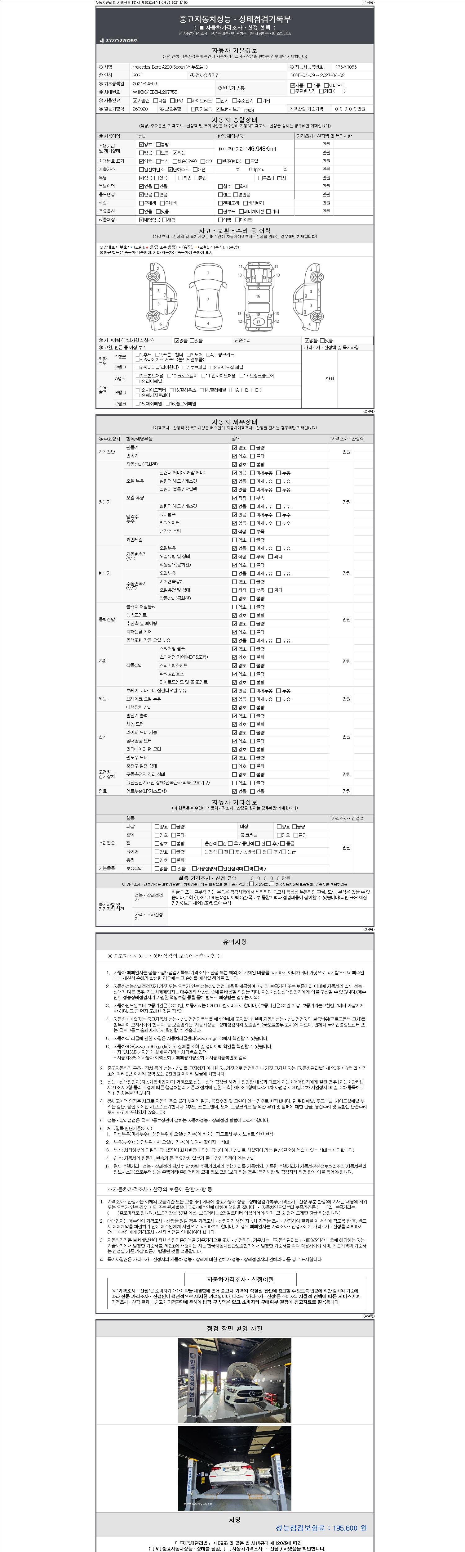 자동차관리법 시행규칙 제120조의 규정에 따라 별지 제 82호서식 《중고자동차 성능, 상태점검 기록부》를 발행한 성능, 상태점검자 및 매매자는 아래의 보증기간 또는 보증거리 이내의 중고자동차, 성능점검 기록부에 기재된 내용과 자동차의 실제 성능, 상태가 다른 경우 계약 또는 관계법령에 따라 매수인에 대하여 책임을 집니다.