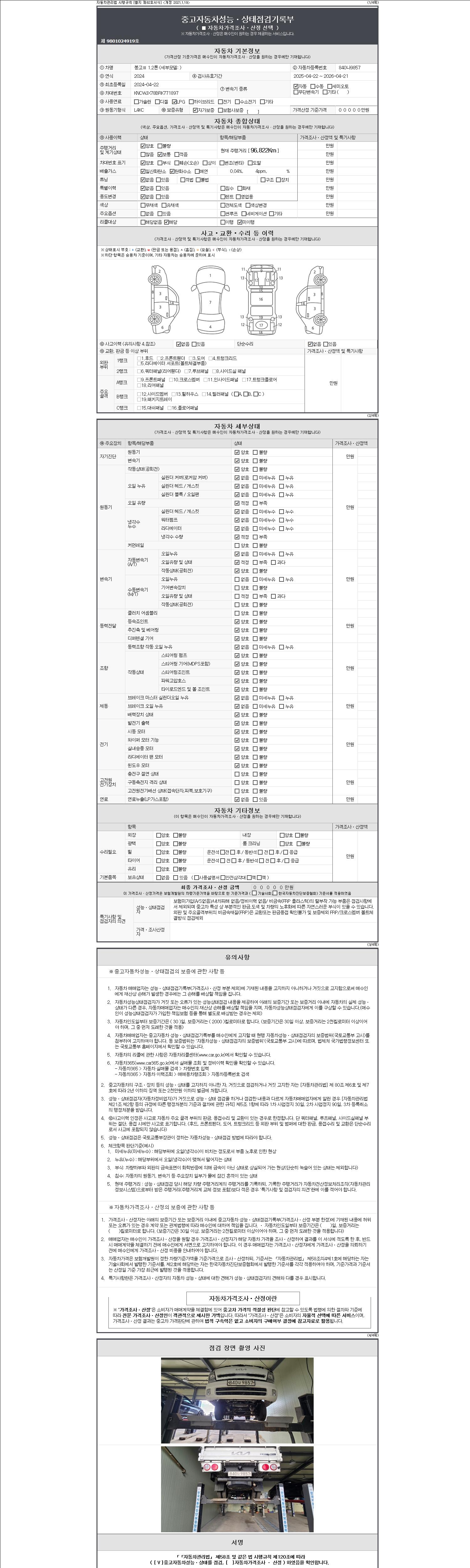 자동차관리법 시행규칙 제120조의 규정에 따라 별지 제 82호서식 《중고자동차 성능, 상태점검 기록부》를 발행한 성능, 상태점검자 및 매매자는 아래의 보증기간 또는 보증거리 이내의 중고자동차, 성능점검 기록부에 기재된 내용과 자동차의 실제 성능, 상태가 다른 경우 계약 또는 관계법령에 따라 매수인에 대하여 책임을 집니다.