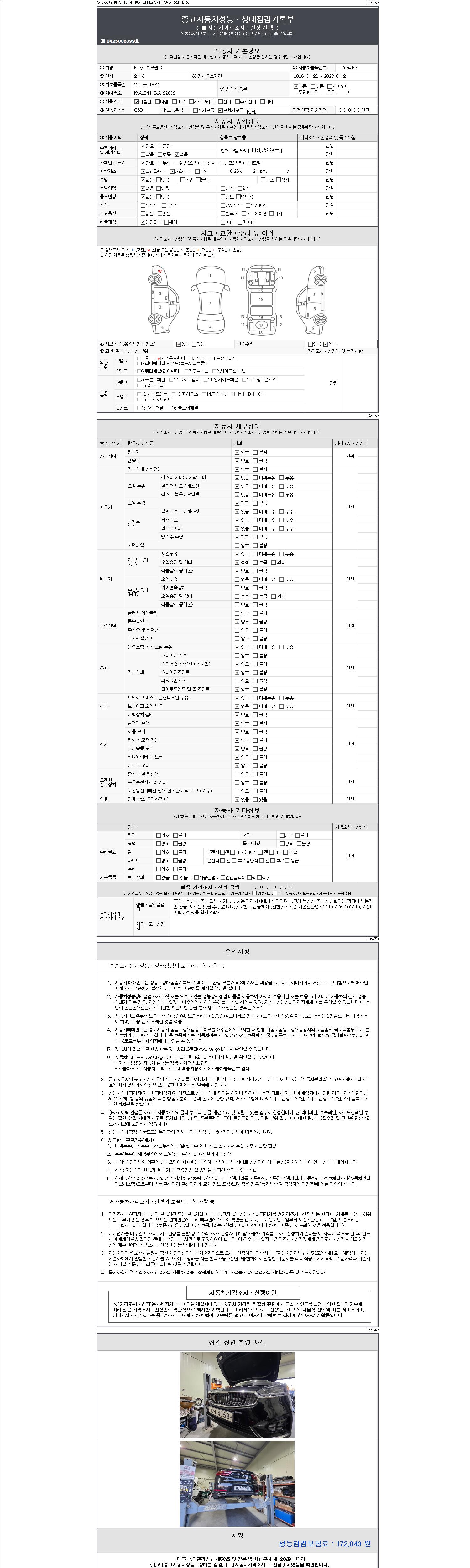 자동차관리법 시행규칙 제120조의 규정에 따라 별지 제 82호서식 《중고자동차 성능, 상태점검 기록부》를 발행한 성능, 상태점검자 및 매매자는 아래의 보증기간 또는 보증거리 이내의 중고자동차, 성능점검 기록부에 기재된 내용과 자동차의 실제 성능, 상태가 다른 경우 계약 또는 관계법령에 따라 매수인에 대하여 책임을 집니다.