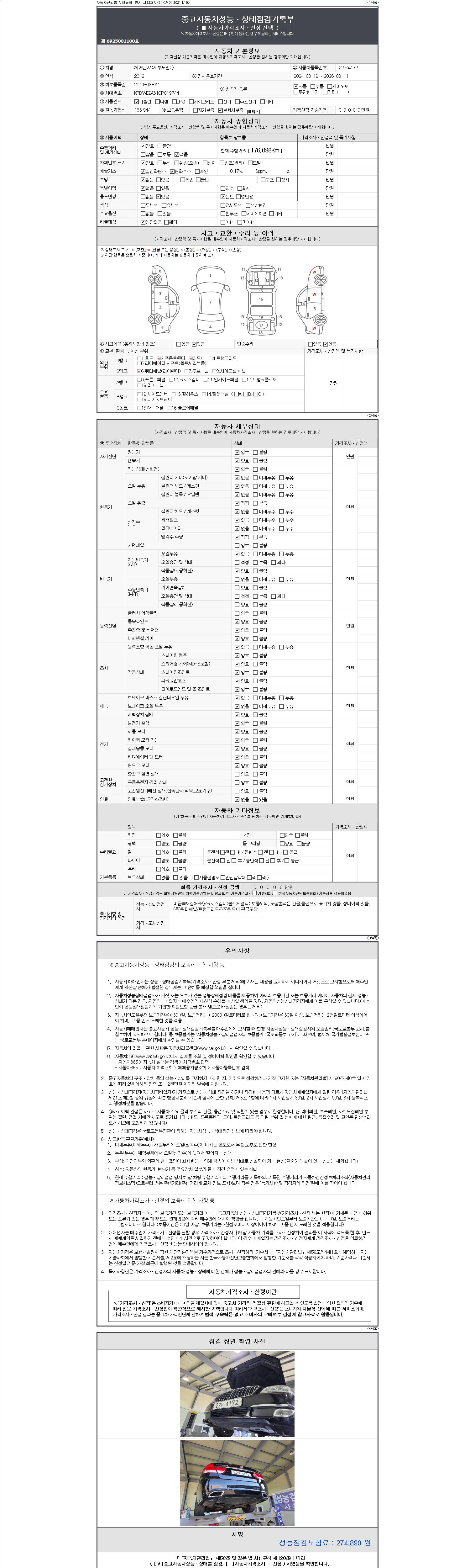 -중고자동차 매매업자를 통해 차량을 구입하실 경우 반드시 "중고자동차 성능, 상태점검 기록부"를 교뷰 받으셔야 하며, 매매업자는 반드시 의무 교부 하여야 압니다.