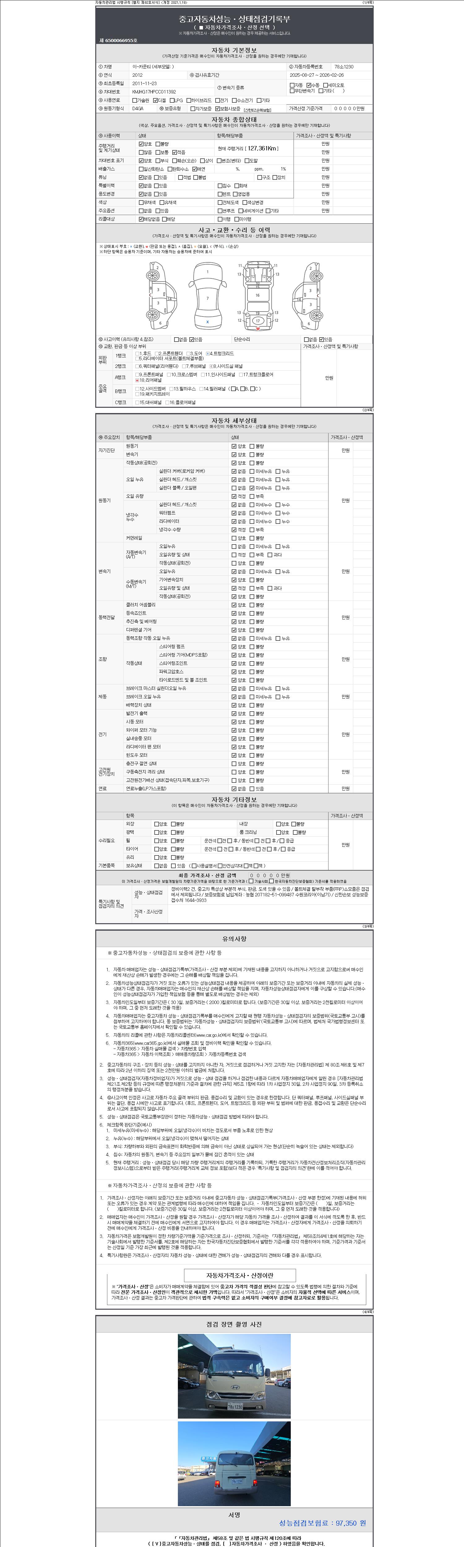 자동차관리법 시행규칙 제120조의 규정에 따라 별지 제 82호서식 《중고자동차 성능, 상태점검 기록부》를 발행한 성능, 상태점검자 및 매매자는 아래의 보증기간 또는 보증거리 이내의 중고자동차, 성능점검 기록부에 기재된 내용과 자동차의 실제 성능, 상태가 다른 경우 계약 또는 관계법령에 따라 매수인에 대하여 책임을 집니다.