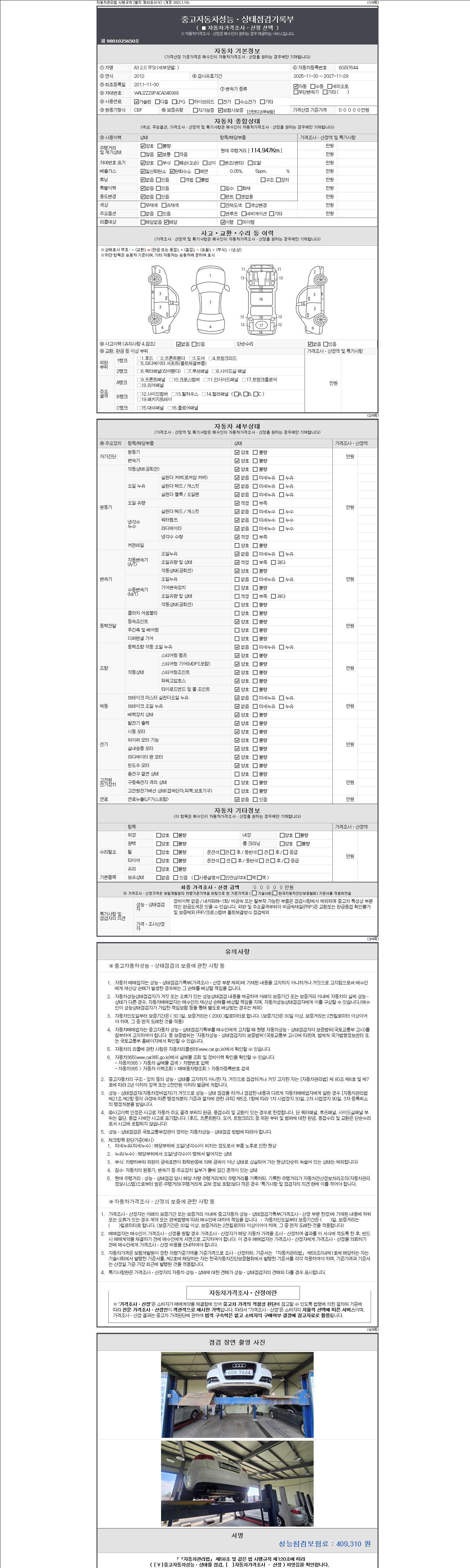 -중고자동차 매매업자를 통해 차량을 구입하실 경우 반드시 "중고자동차 성능, 상태점검 기록부"를 교뷰 받으셔야 하며, 매매업자는 반드시 의무 교부 하여야 압니다.