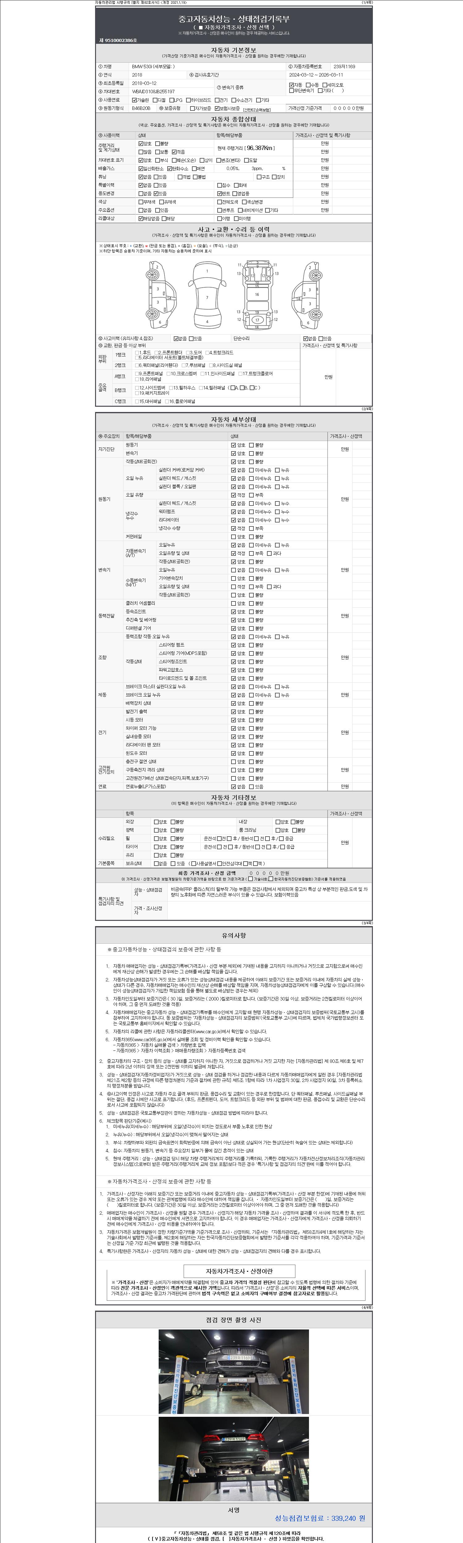 자동차관리법 시행규칙 제120조의 규정에 따라 별지 제 82호서식 《중고자동차 성능, 상태점검 기록부》를 발행한 성능, 상태점검자 및 매매자는 아래의 보증기간 또는 보증거리 이내의 중고자동차, 성능점검 기록부에 기재된 내용과 자동차의 실제 성능, 상태가 다른 경우 계약 또는 관계법령에 따라 매수인에 대하여 책임을 집니다.