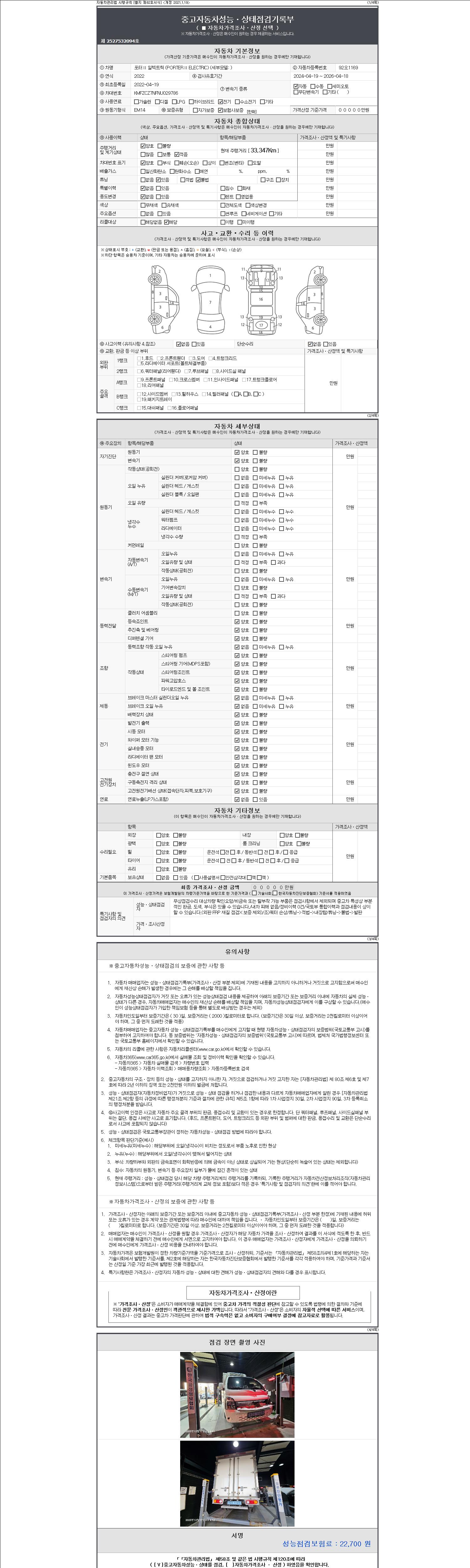 자동차관리법 시행규칙 제120조의 규정에 따라 별지 제 82호서식 《중고자동차 성능, 상태점검 기록부》를 발행한 성능, 상태점검자 및 매매자는 아래의 보증기간 또는 보증거리 이내의 중고자동차, 성능점검 기록부에 기재된 내용과 자동차의 실제 성능, 상태가 다른 경우 계약 또는 관계법령에 따라 매수인에 대하여 책임을 집니다.