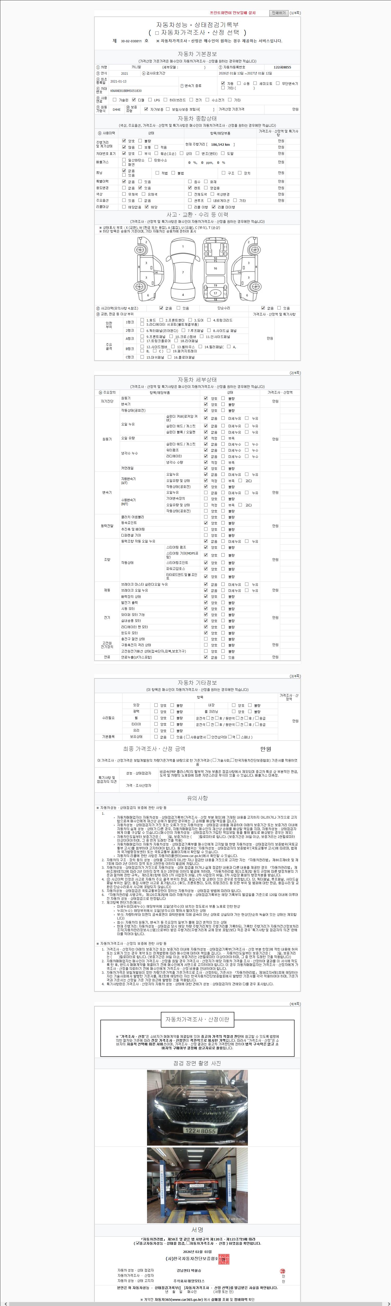 | 주행거리 | 186,538 km | 차량번호 | 122서8055 | 사고유무 | 성능기록부 참조 | 제시번호 | 제 2026010212 호 |