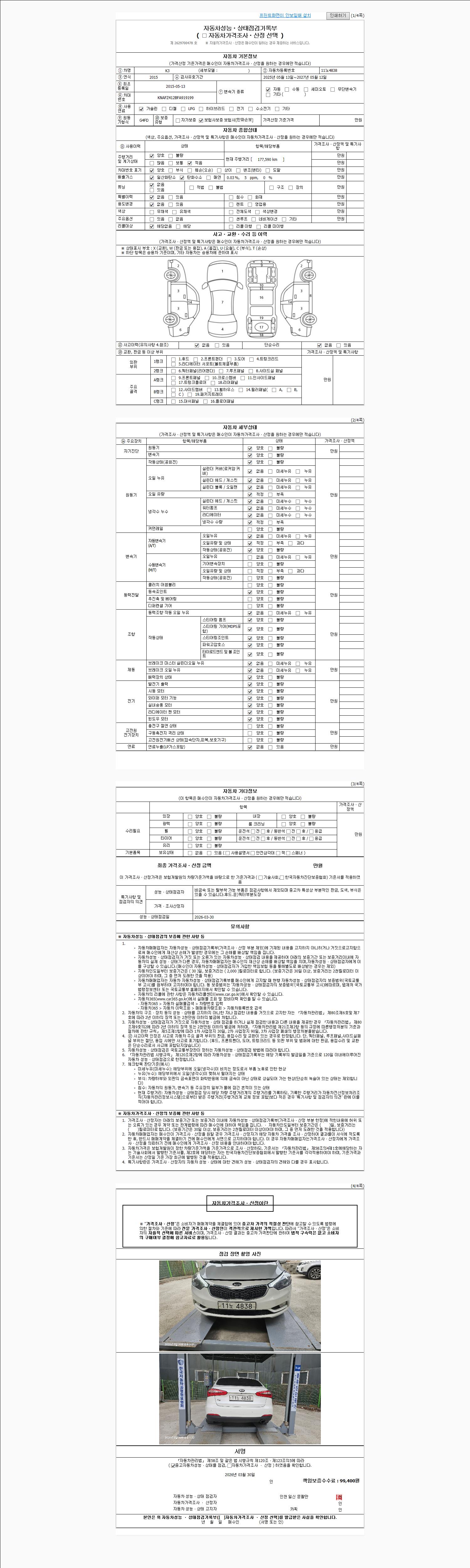 | 주행거리 | 177,586 km | 차량번호 | 11노4838 | 사고유무 | 성능기록부 참조 | 제시번호 | 제 2026016255 호 |
