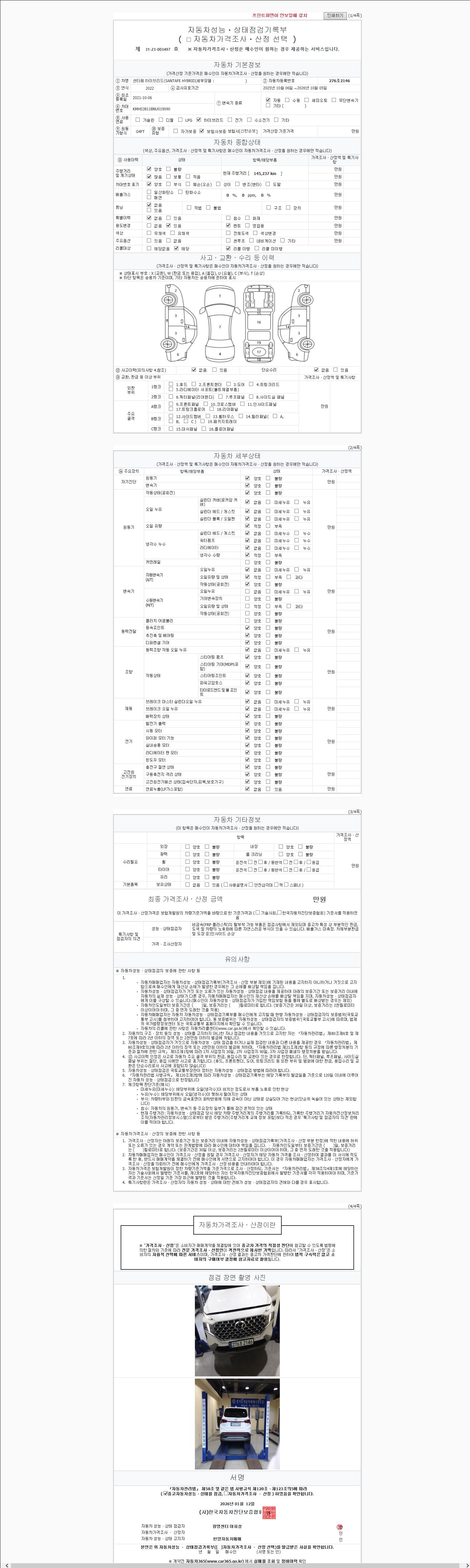 | 주행거리 | 145,100 km | 차량번호 | 276조2146 | 사고유무 | 성능기록부 참조 | 제시번호 | 제 2147483647 호 |
