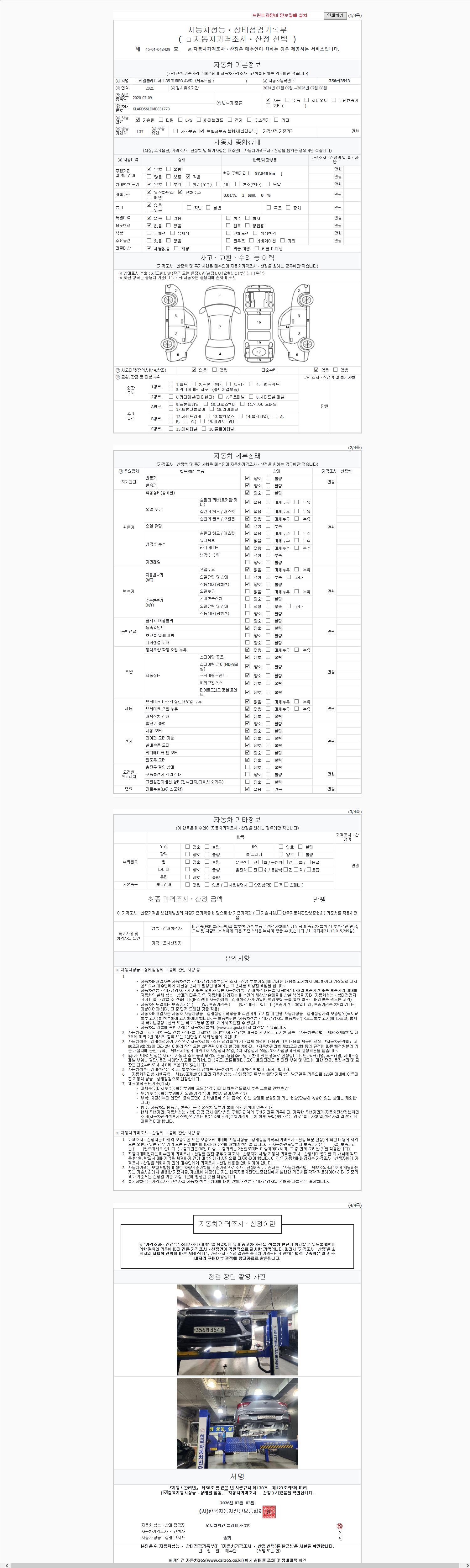 | 주행거리 | 57,848 km | 차량번호 | 356러3543 | 사고유무 | 성능기록부 참조 | 제시번호 | 제 2147483647 호 |