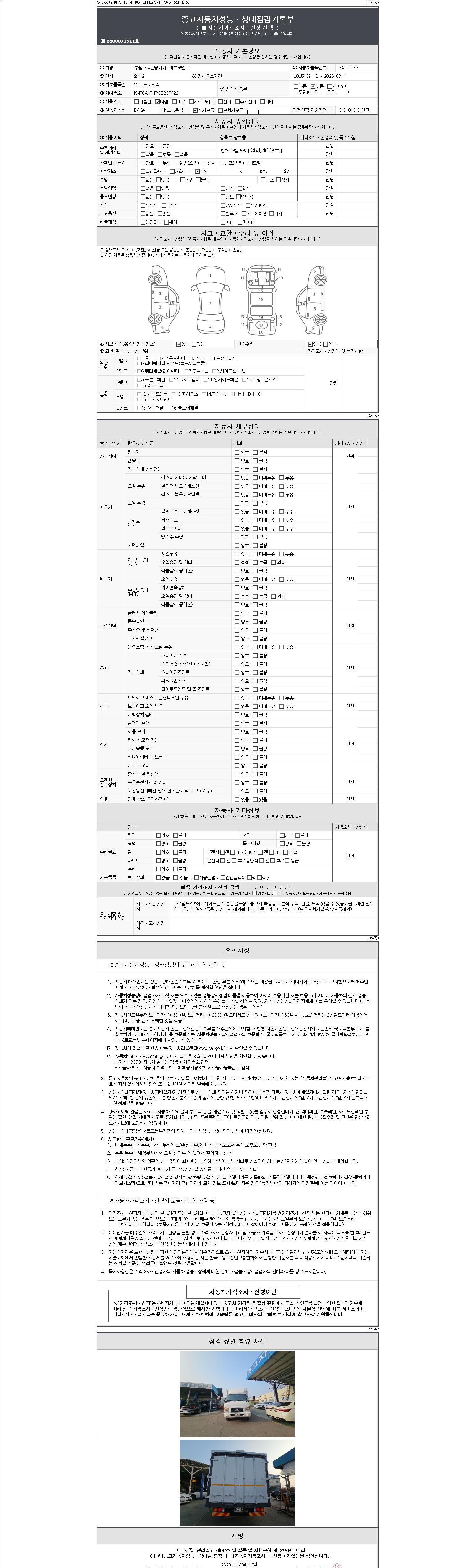 -중고자동차 매매업자를 통해 차량을 구입하실 경우 반드시 "중고자동차 성능, 상태점검 기록부"를 교뷰 받으셔야 하며, 매매업자는 반드시 의무 교부 하여야 압니다.