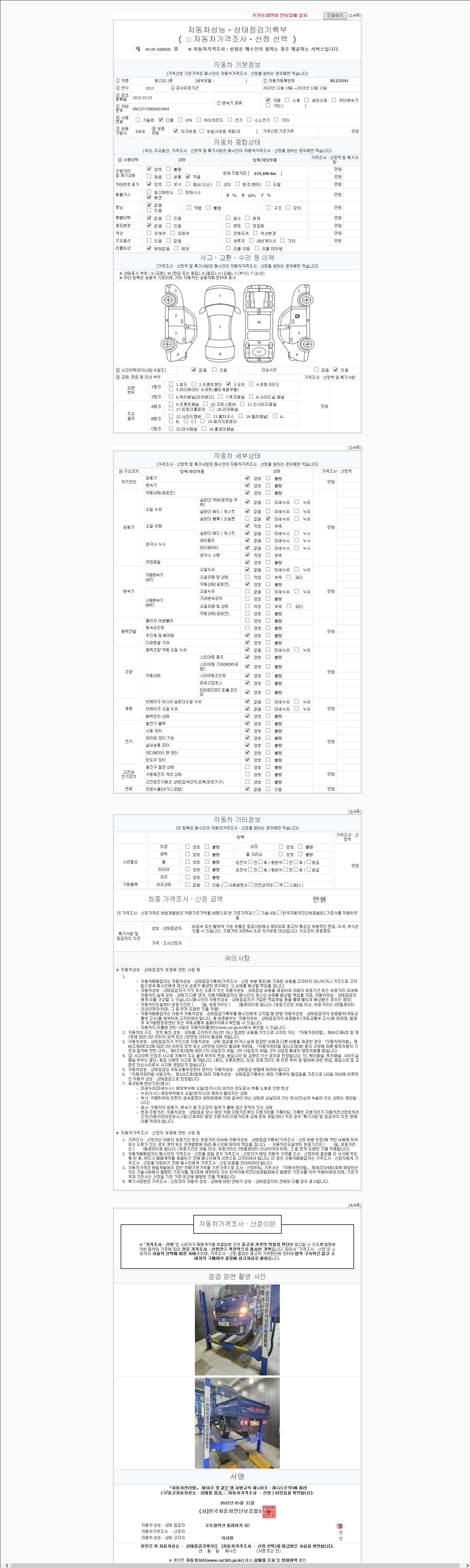 | 주행거리 | 219,212 km | 차량번호 | 85고2541 | 사고유무 | 성능기록부 참조 | 제시번호 | 제 2147483647 호 |