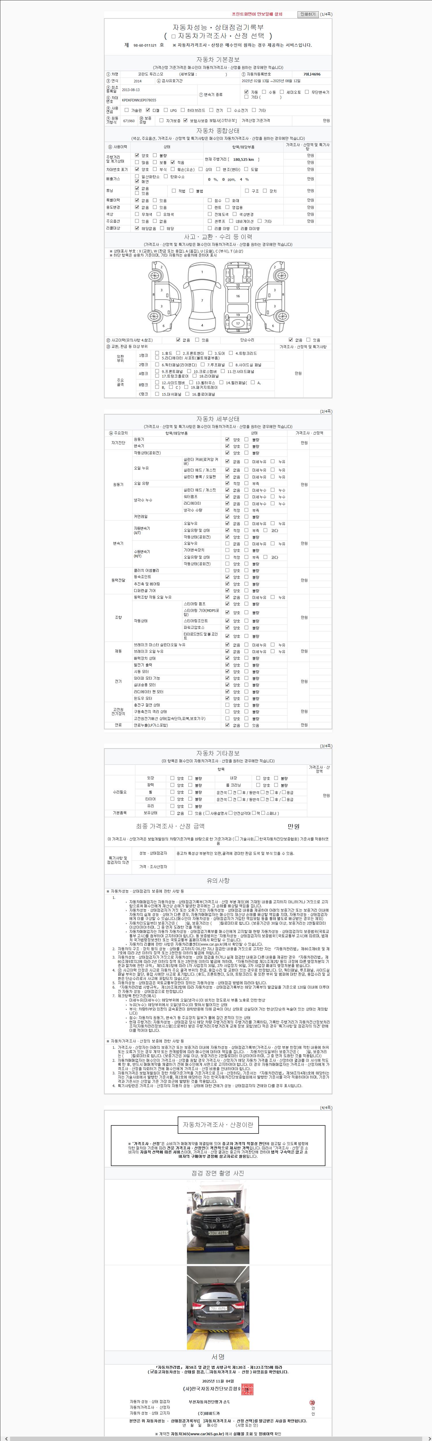 | 주행거리 | 180,502 km | 차량번호 | 70나4696 | 사고유무 | 성능기록부 참조 | 제시번호 | 제 2025054006 호 |