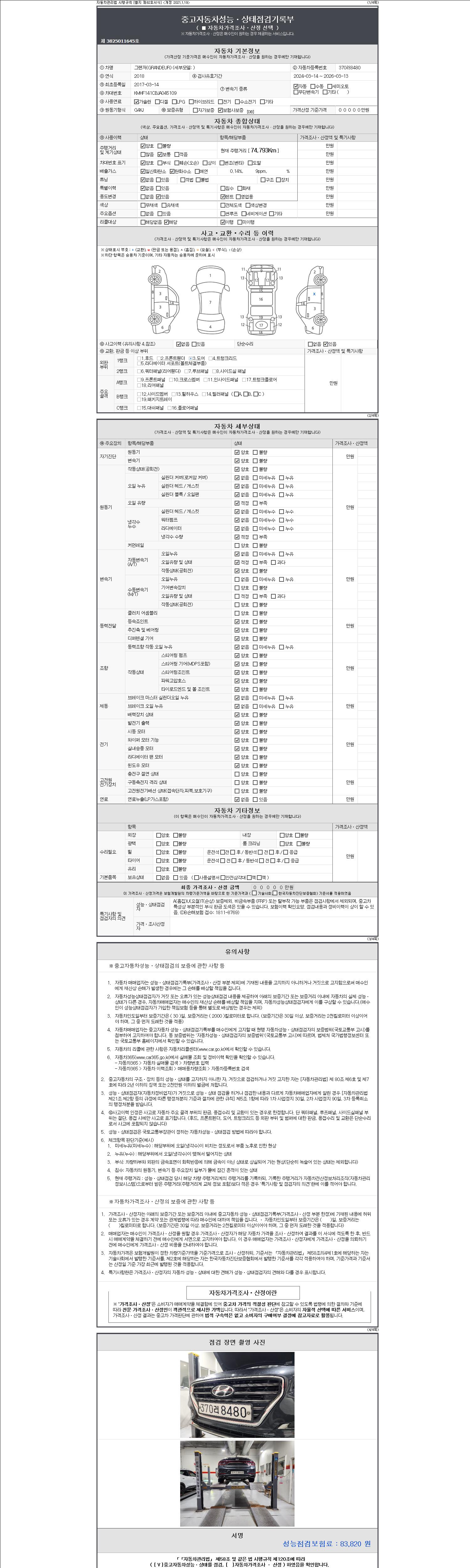 | 주행거리 | 74,793 km | 차량번호 | 370러8480 | 사고유무 | 성능기록부 참조 | 제시번호 | 제 2147483647 호 |