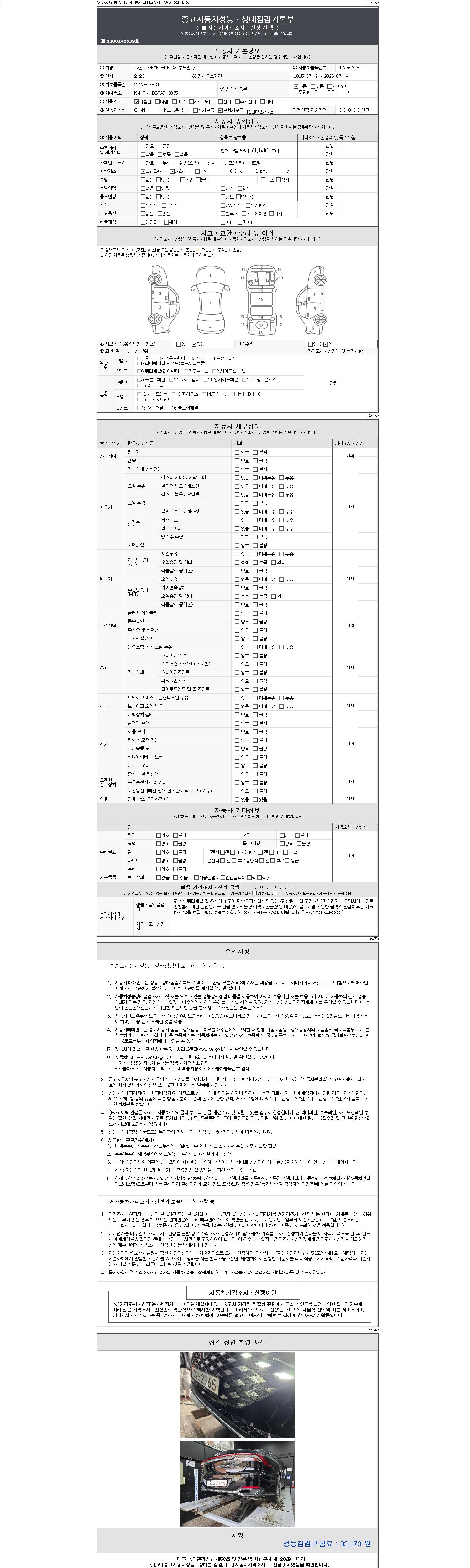 자동차관리법 시행규칙 제120조의 규정에 따라 별지 제 82호서식 《중고자동차 성능, 상태점검 기록부》를 발행한 성능, 상태점검자 및 매매자는 아래의 보증기간 또는 보증거리 이내의 중고자동차, 성능점검 기록부에 기재된 내용과 자동차의 실제 성능, 상태가 다른 경우 계약 또는 관계법령에 따라 매수인에 대하여 책임을 집니다.