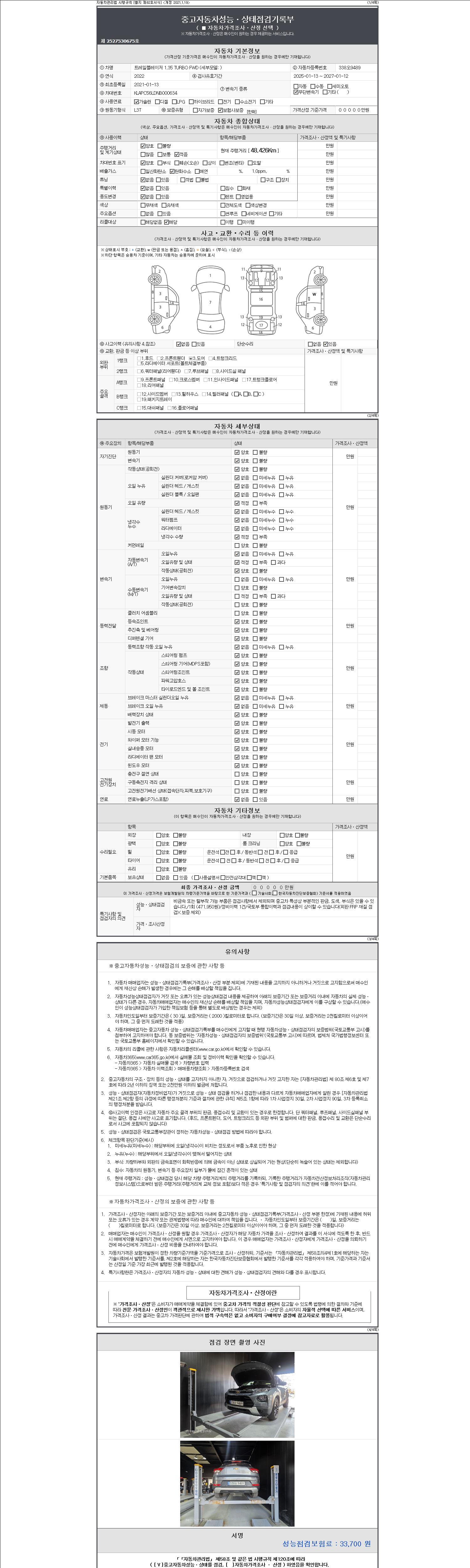 -중고자동차 매매업자를 통해 차량을 구입하실 경우 반드시 "중고자동차 성능, 상태점검 기록부"를 교뷰 받으셔야 하며, 매매업자는 반드시 의무 교부 하여야 압니다.