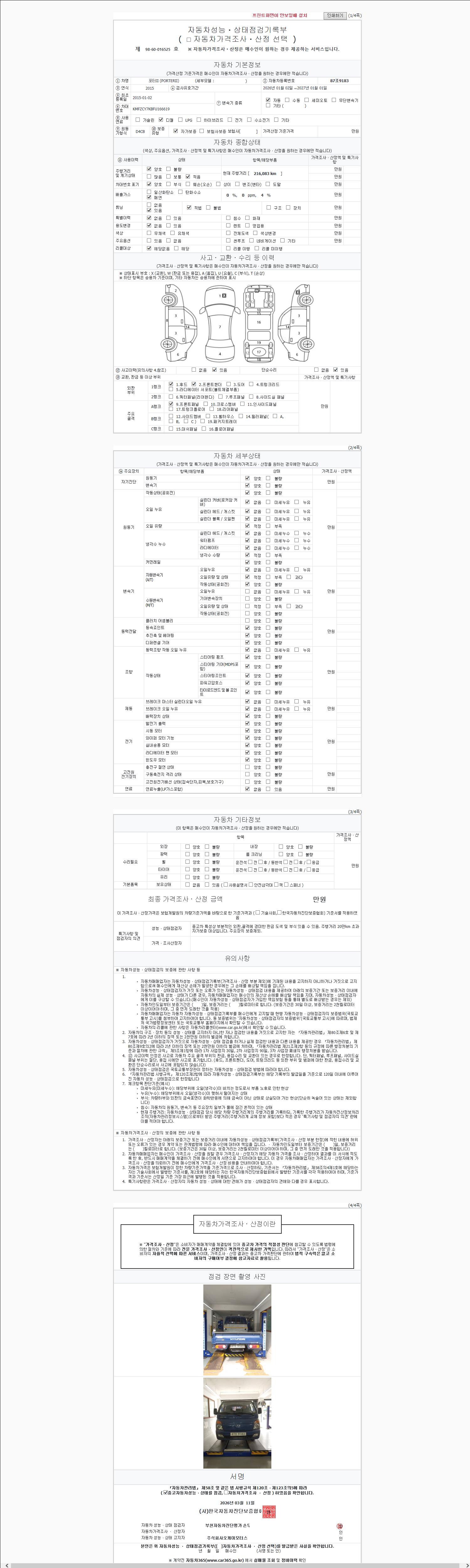 | 주행거리 | 216,083 km | 차량번호 | 87조9183 | 사고유무 | 성능기록부 참조 | 제시번호 | 제 2026016695 호 |