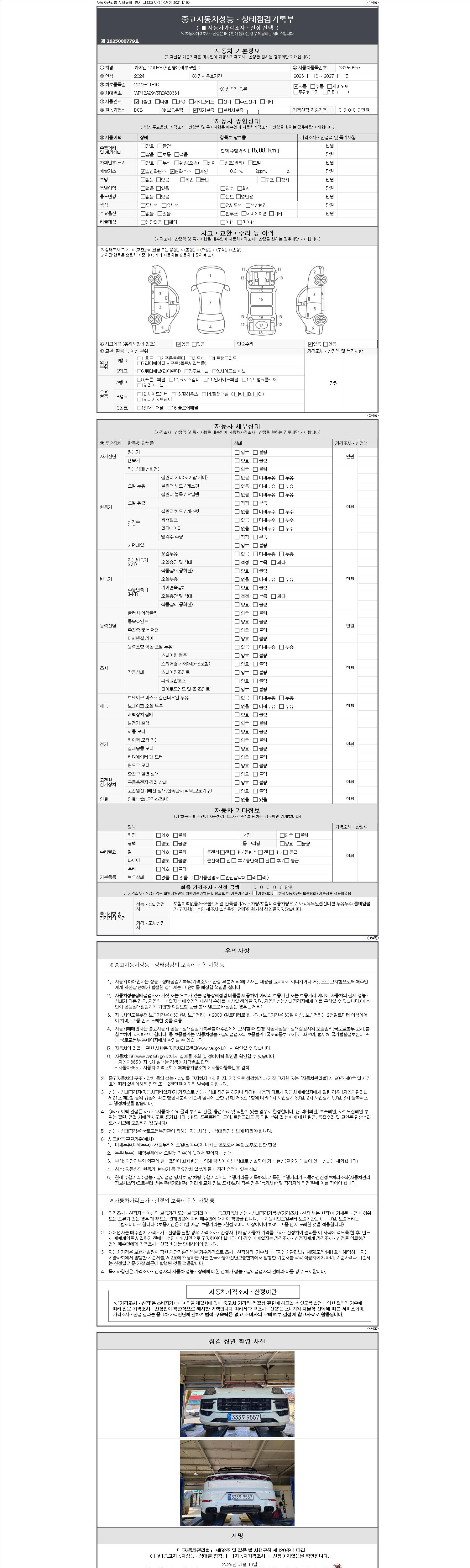 | 주행거리 | 15,081 km | 차량번호 | 333도9557 | 사고유무 | 성능기록부 참조 | 제시번호 | 제 2147483647 호 |