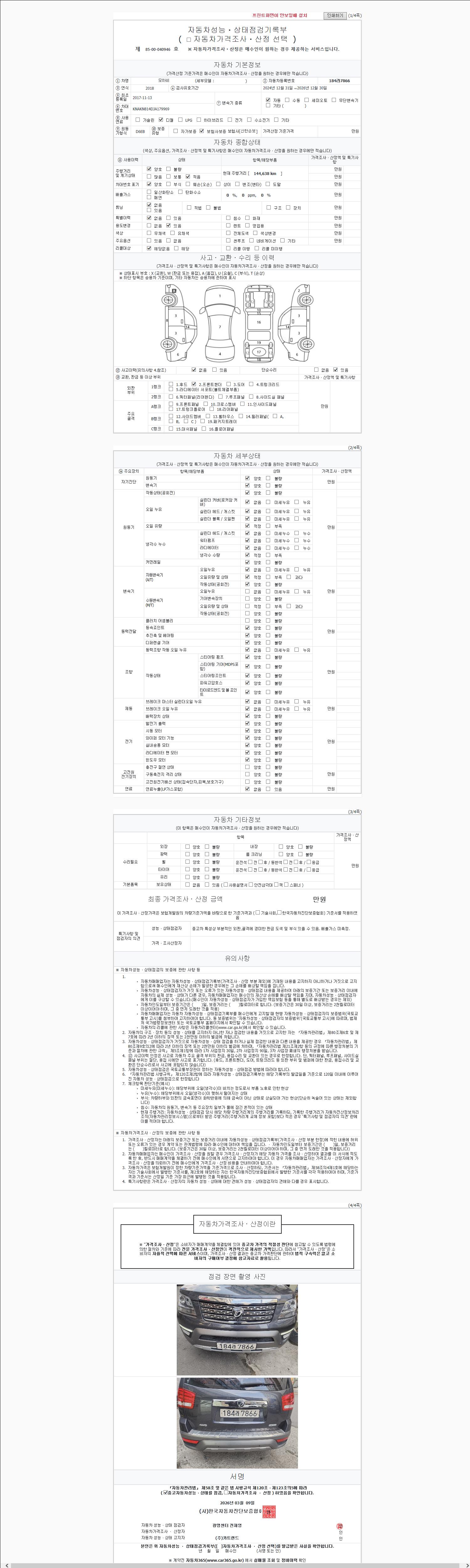| 주행거리 | 144,638 km | 차량번호 | 184라7866 | 사고유무 | 성능기록부 참조 | 제시번호 | 제 2147483647 호 |