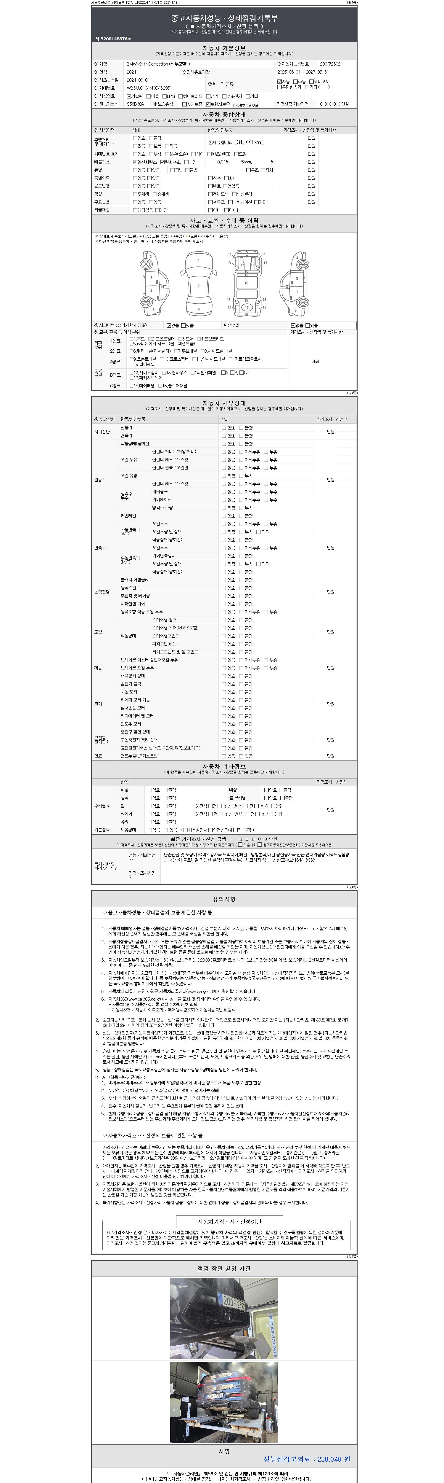 자동차관리법 시행규칙 제120조의 규정에 따라 별지 제 82호서식 《중고자동차 성능, 상태점검 기록부》를 발행한 성능, 상태점검자 및 매매자는 아래의 보증기간 또는 보증거리 이내의 중고자동차, 성능점검 기록부에 기재된 내용과 자동차의 실제 성능, 상태가 다른 경우 계약 또는 관계법령에 따라 매수인에 대하여 책임을 집니다.