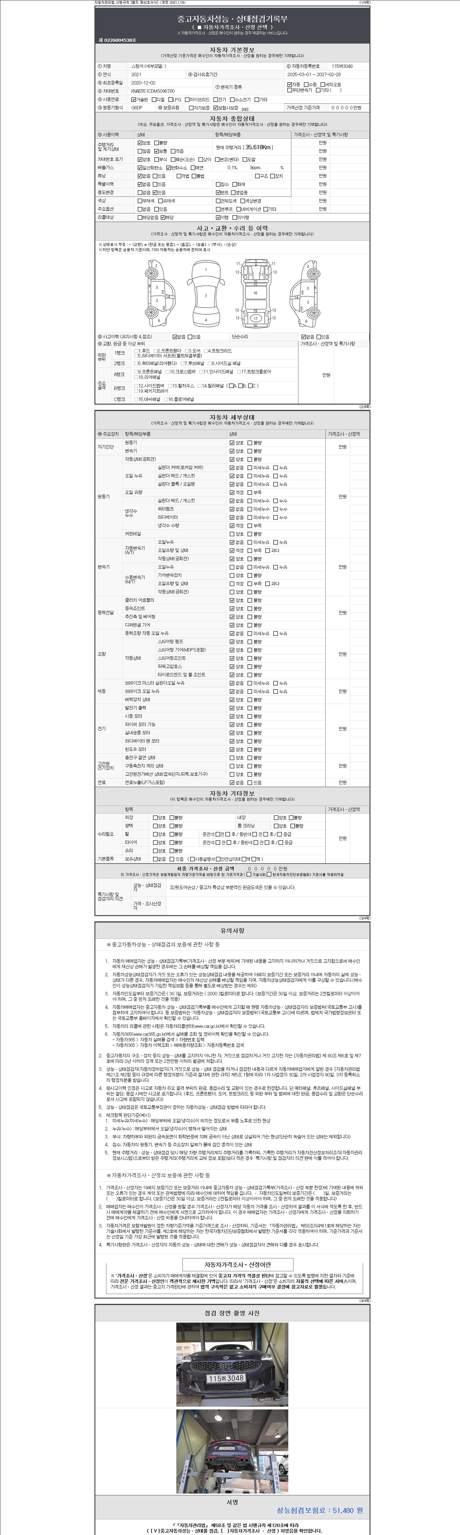 | 주행거리 | 35,587 km | 차량번호 | 115버3048 | 사고유무 | 성능기록부 참조 | 제시번호 | 제 2147483647 호 |