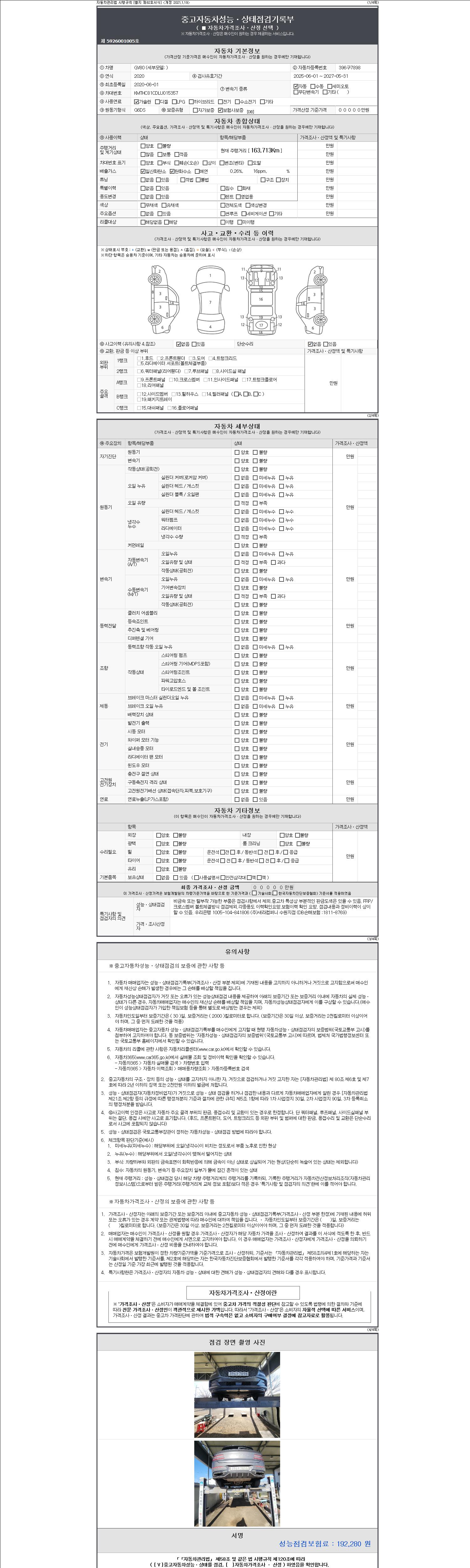 자동차관리법 시행규칙 제120조의 규정에 따라 별지 제 82호서식 《중고자동차 성능, 상태점검 기록부》를 발행한 성능, 상태점검자 및 매매자는 아래의 보증기간 또는 보증거리 이내의 중고자동차, 성능점검 기록부에 기재된 내용과 자동차의 실제 성능, 상태가 다른 경우 계약 또는 관계법령에 따라 매수인에 대하여 책임을 집니다.
