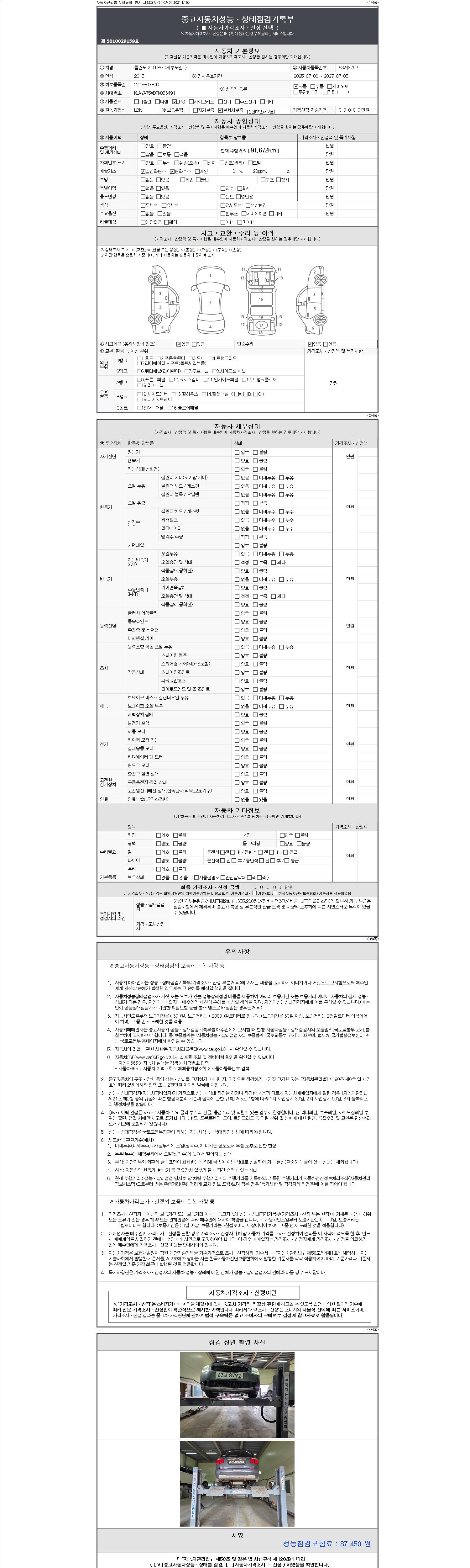 자동차관리법 시행규칙 제120조의 규정에 따라 별지 제 82호서식 《중고자동차 성능, 상태점검 기록부》를 발행한 성능, 상태점검자 및 매매자는 아래의 보증기간 또는 보증거리 이내의 중고자동차, 성능점검 기록부에 기재된 내용과 자동차의 실제 성능, 상태가 다른 경우 계약 또는 관계법령에 따라 매수인에 대하여 책임을 집니다.