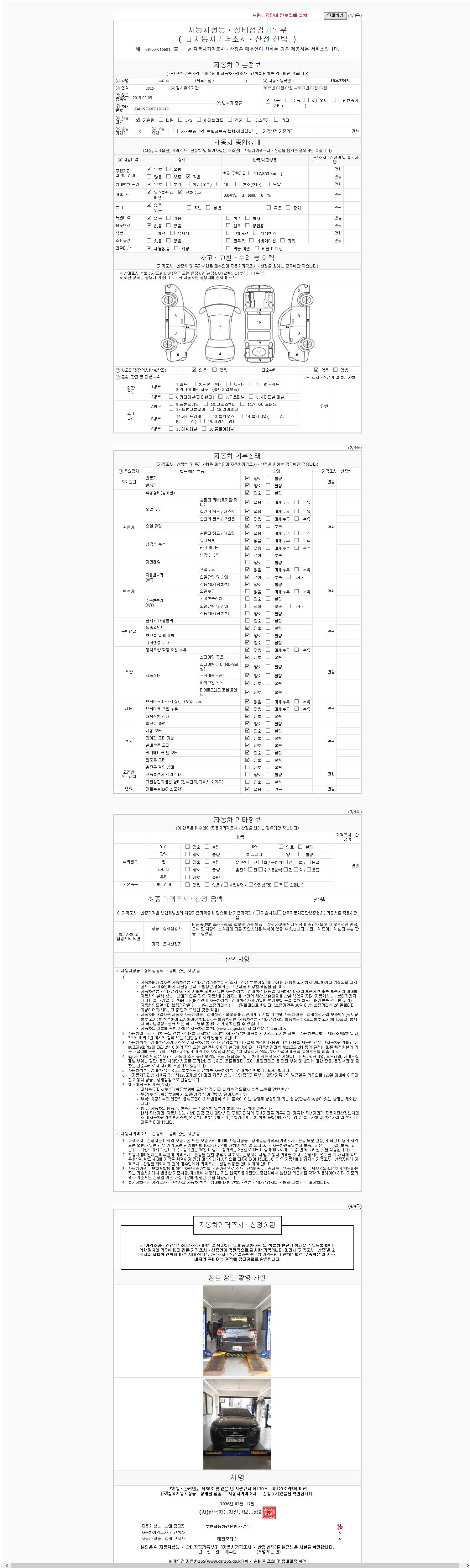 | 주행거리 | 117,852 km | 차량번호 | 18우7545 | 사고유무 | 성능기록부 참조 | 제시번호 | 제 2026047803 호 |