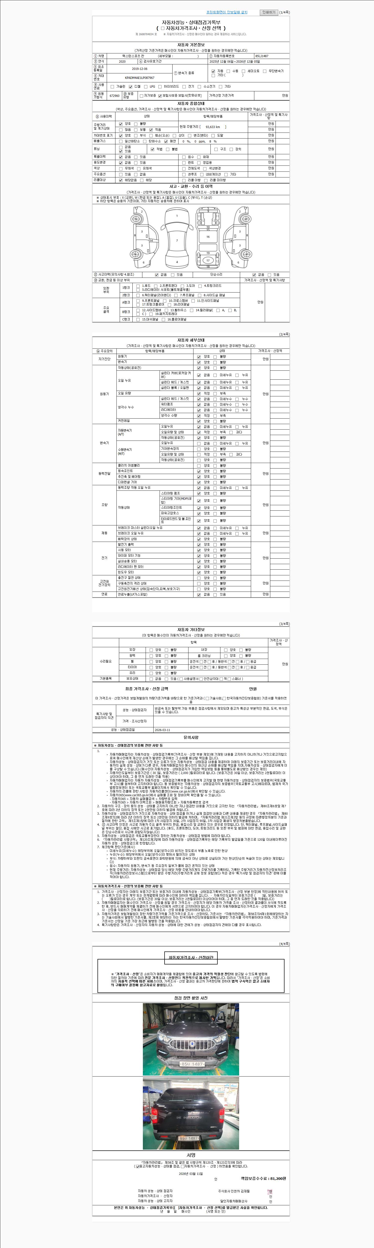 | 주행거리 | 93,633 km | 차량번호 | 85나1487 | 사고유무 | 성능기록부 참조 | 제시번호 | 제 2026012716 호 |