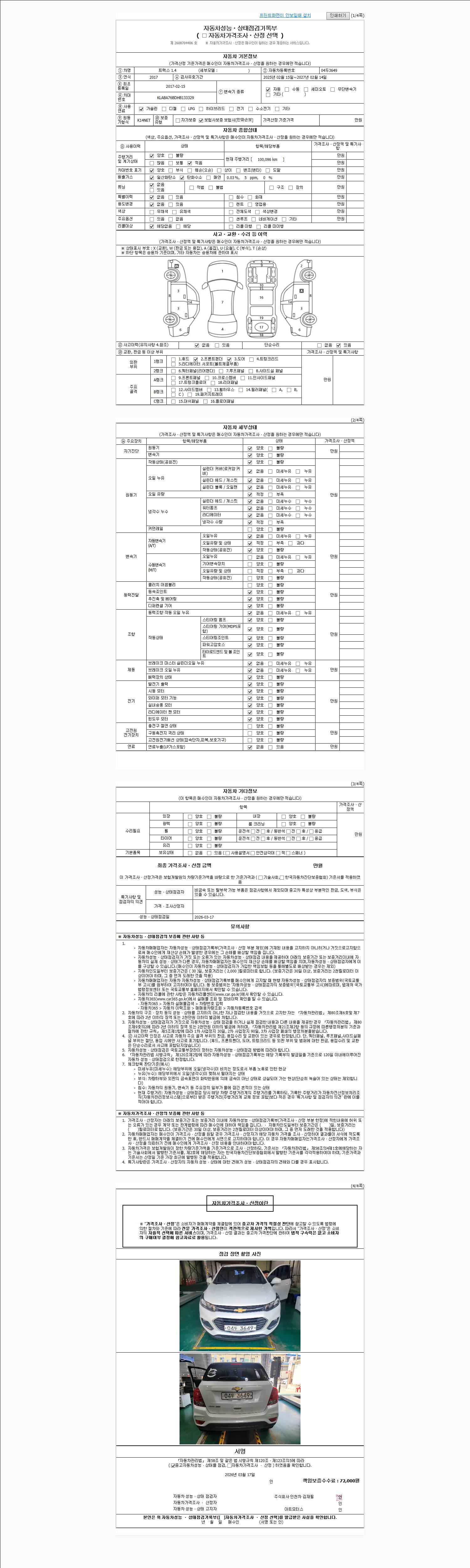 자동차관리법 시행규칙 제120조의 규정에 따라 별지 제 82호서식 《중고자동차 성능, 상태점검 기록부》를 발행한 성능, 상태점검자 및 매매자는 아래의 보증기간 또는 보증거리 이내의 중고자동차, 성능점검 기록부에 기재된 내용과 자동차의 실제 성능, 상태가 다른 경우 계약 또는 관계법령에 따라 매수인에 대하여 책임을 집니다.