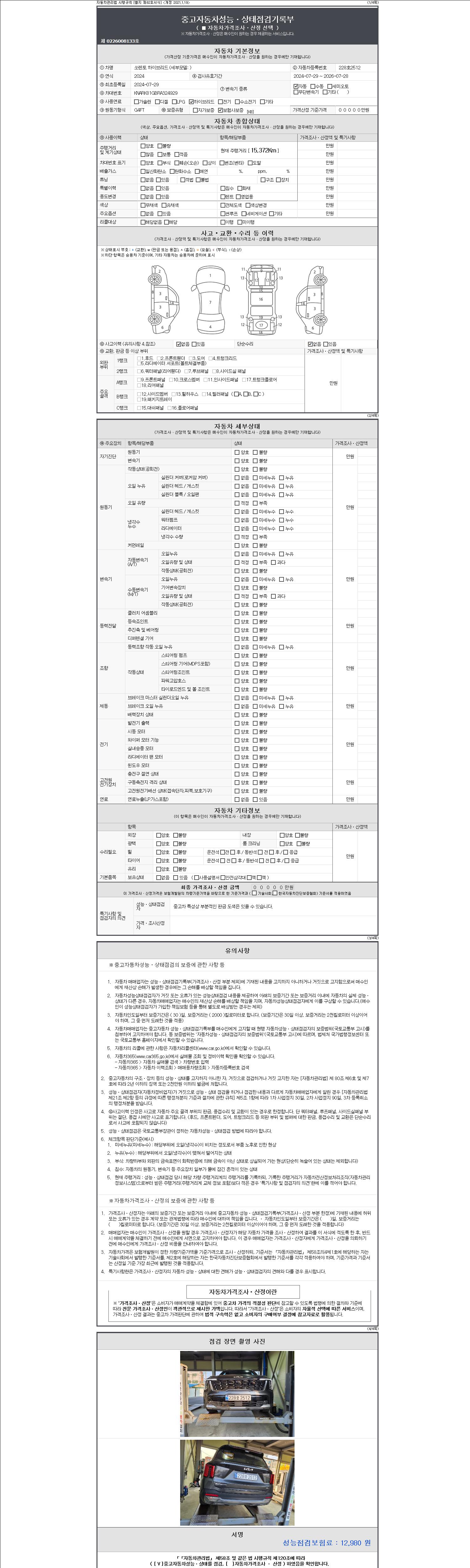 자동차관리법 시행규칙 제120조의 규정에 따라 별지 제 82호서식 《중고자동차 성능, 상태점검 기록부》를 발행한 성능, 상태점검자 및 매매자는 아래의 보증기간 또는 보증거리 이내의 중고자동차, 성능점검 기록부에 기재된 내용과 자동차의 실제 성능, 상태가 다른 경우 계약 또는 관계법령에 따라 매수인에 대하여 책임을 집니다.