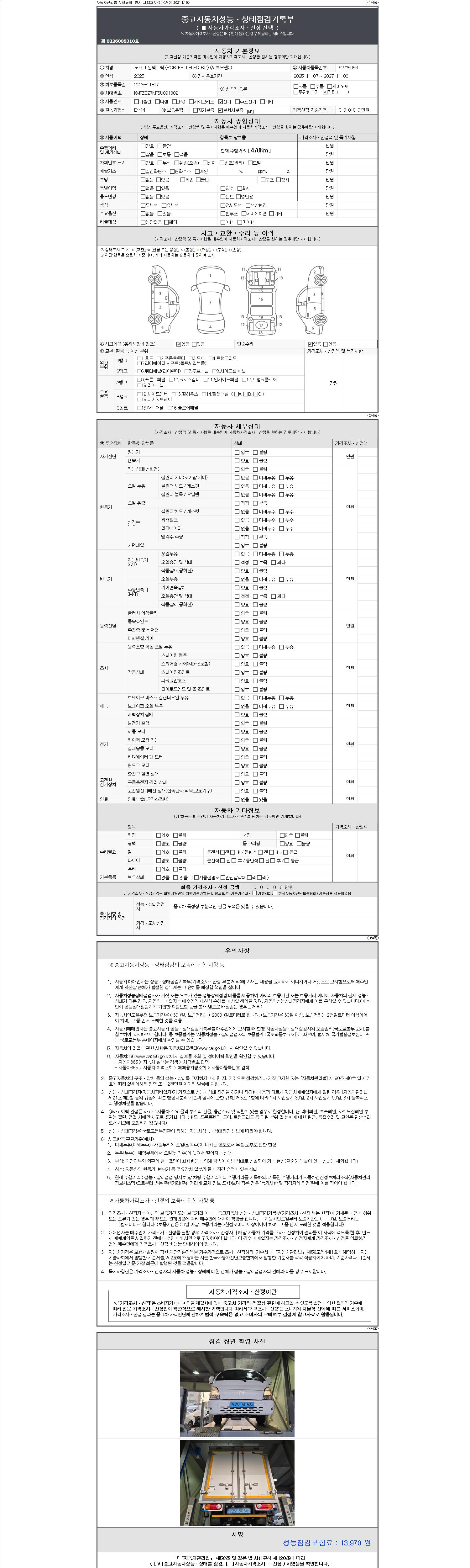 | 주행거리 | 470 km | 차량번호 | 92보5056 | 사고유무 | 성능기록부 참조 | 제시번호 | 제 2147483647 호 |