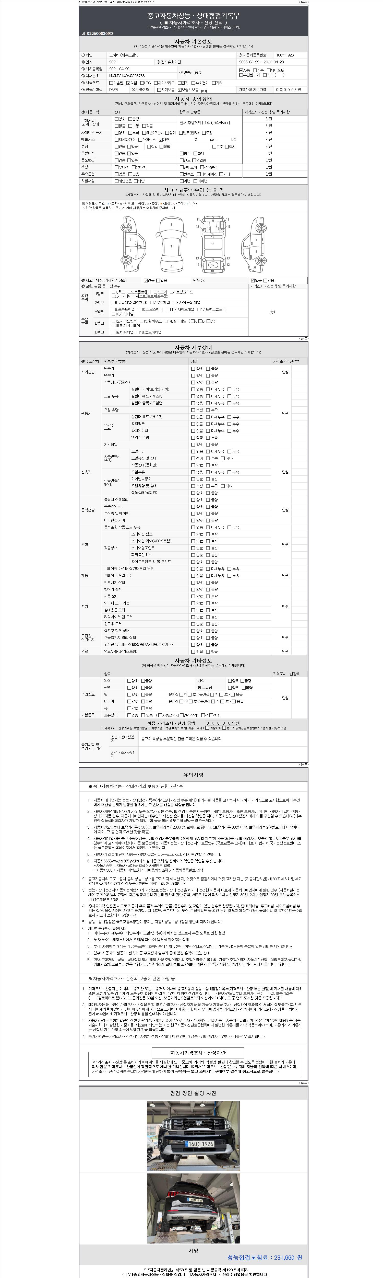 자동차관리법 시행규칙 제120조의 규정에 따라 별지 제 82호서식 《중고자동차 성능, 상태점검 기록부》를 발행한 성능, 상태점검자 및 매매자는 아래의 보증기간 또는 보증거리 이내의 중고자동차, 성능점검 기록부에 기재된 내용과 자동차의 실제 성능, 상태가 다른 경우 계약 또는 관계법령에 따라 매수인에 대하여 책임을 집니다.