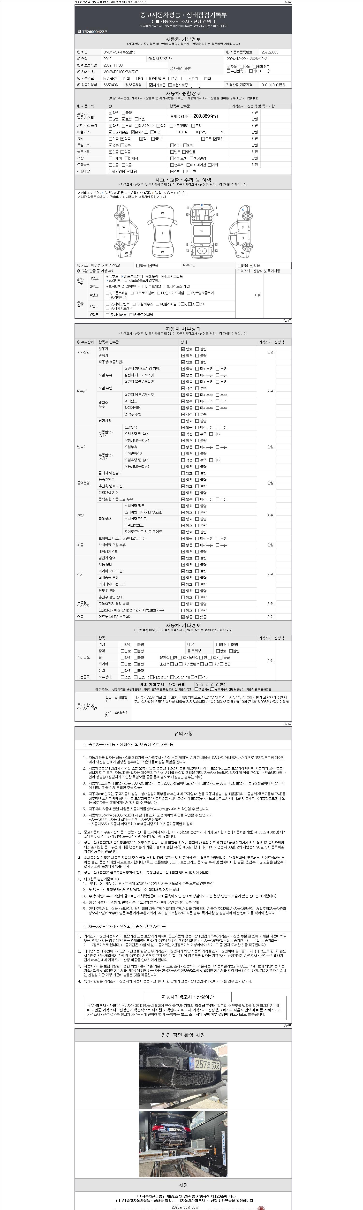자동차관리법 시행규칙 제120조의 규정에 따라 별지 제 82호서식 《중고자동차 성능, 상태점검 기록부》를 발행한 성능, 상태점검자 및 매매자는 아래의 보증기간 또는 보증거리 이내의 중고자동차, 성능점검 기록부에 기재된 내용과 자동차의 실제 성능, 상태가 다른 경우 계약 또는 관계법령에 따라 매수인에 대하여 책임을 집니다.