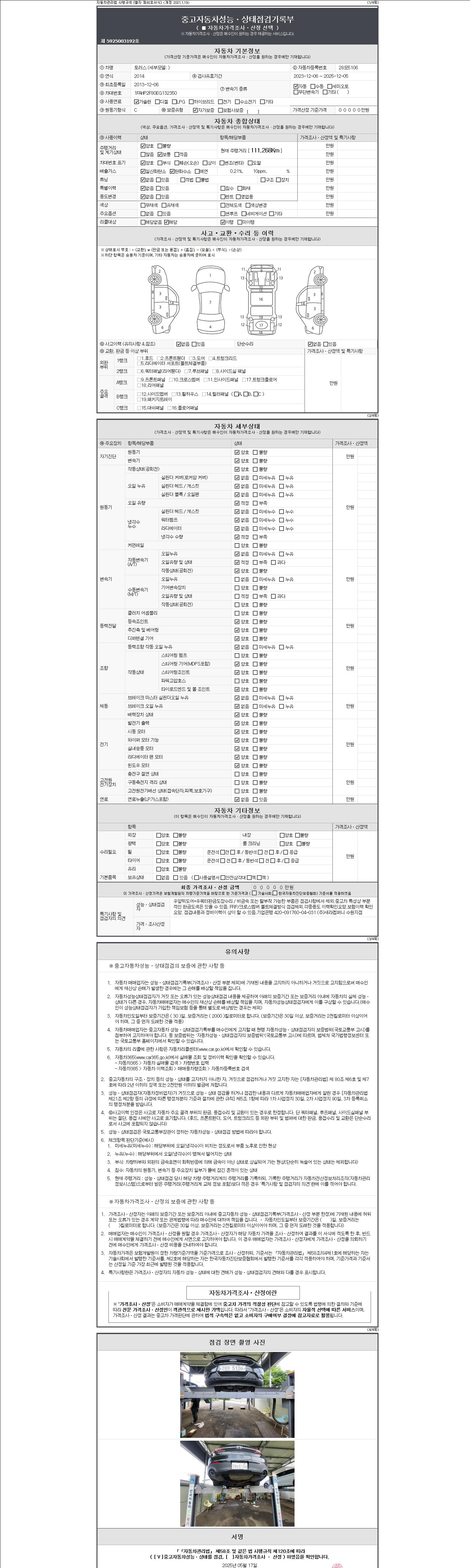- 2. 차량 등록증이나 성능점검지 등을 상담자에게 요청및 확인하시고 사전에 미리 점검 하시기를 권유드립니다.