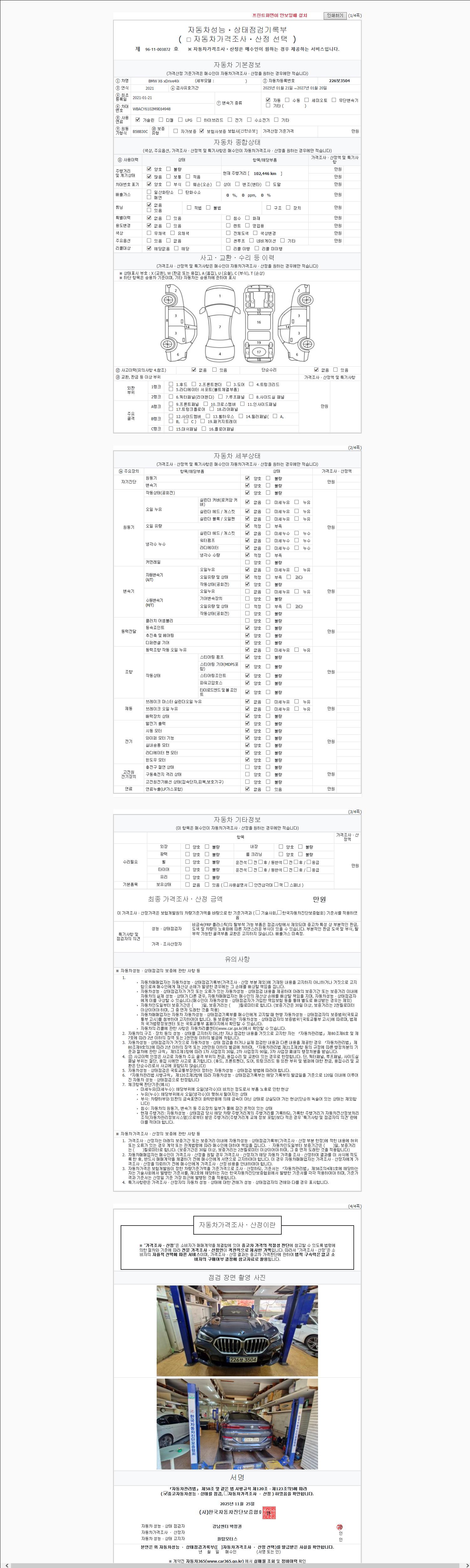 | 주행거리 | 102,446 km | 차량번호 | 226보3504 | 사고유무 | 성능기록부 참조 | 제시번호 | 제 2025160152 호 |