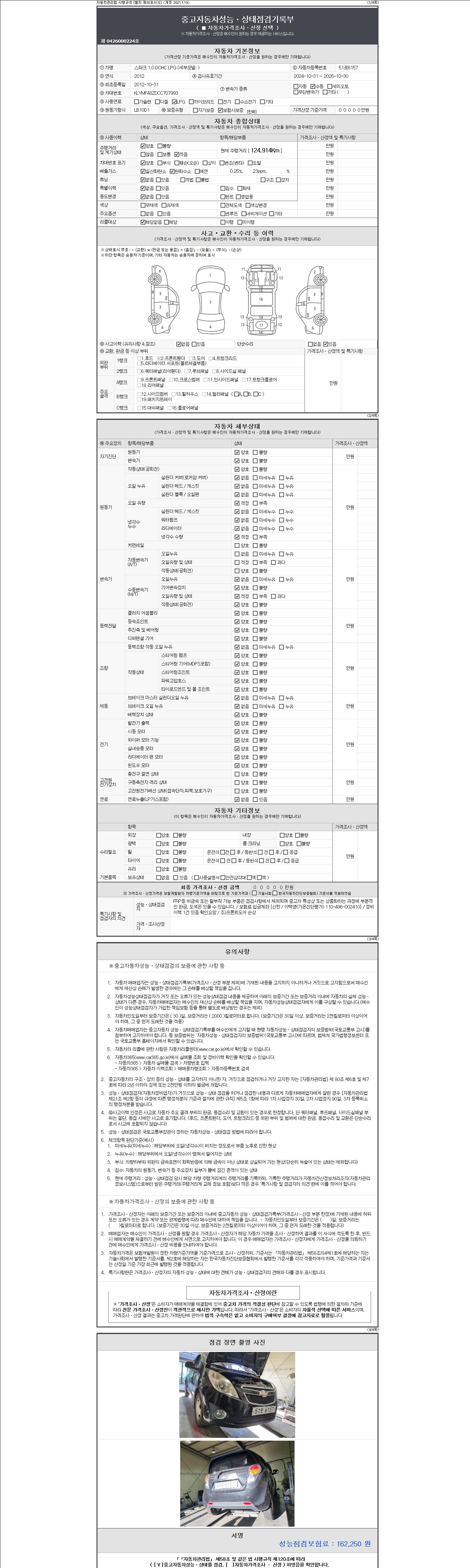 자동차관리법 시행규칙 제120조의 규정에 따라 별지 제 82호서식 《중고자동차 성능, 상태점검 기록부》를 발행한 성능, 상태점검자 및 매매자는 아래의 보증기간 또는 보증거리 이내의 중고자동차, 성능점검 기록부에 기재된 내용과 자동차의 실제 성능, 상태가 다른 경우 계약 또는 관계법령에 따라 매수인에 대하여 책임을 집니다.
