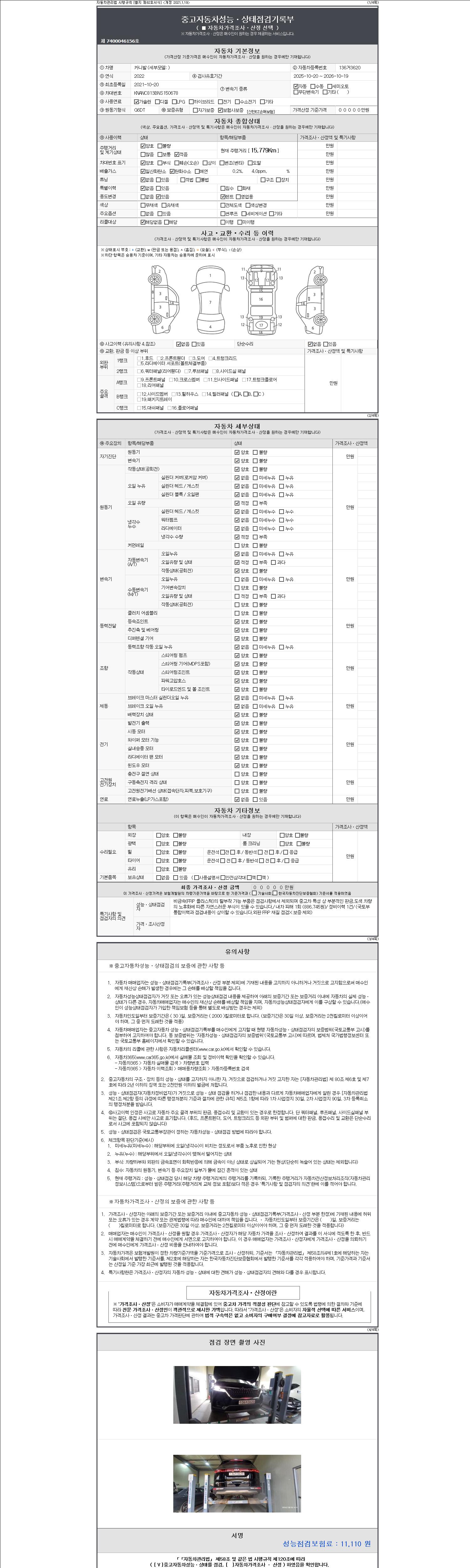 자동차관리법 시행규칙 제120조의 규정에 따라 별지 제 82호서식 《중고자동차 성능, 상태점검 기록부》를 발행한 성능, 상태점검자 및 매매자는 아래의 보증기간 또는 보증거리 이내의 중고자동차, 성능점검 기록부에 기재된 내용과 자동차의 실제 성능, 상태가 다른 경우 계약 또는 관계법령에 따라 매수인에 대하여 책임을 집니다.