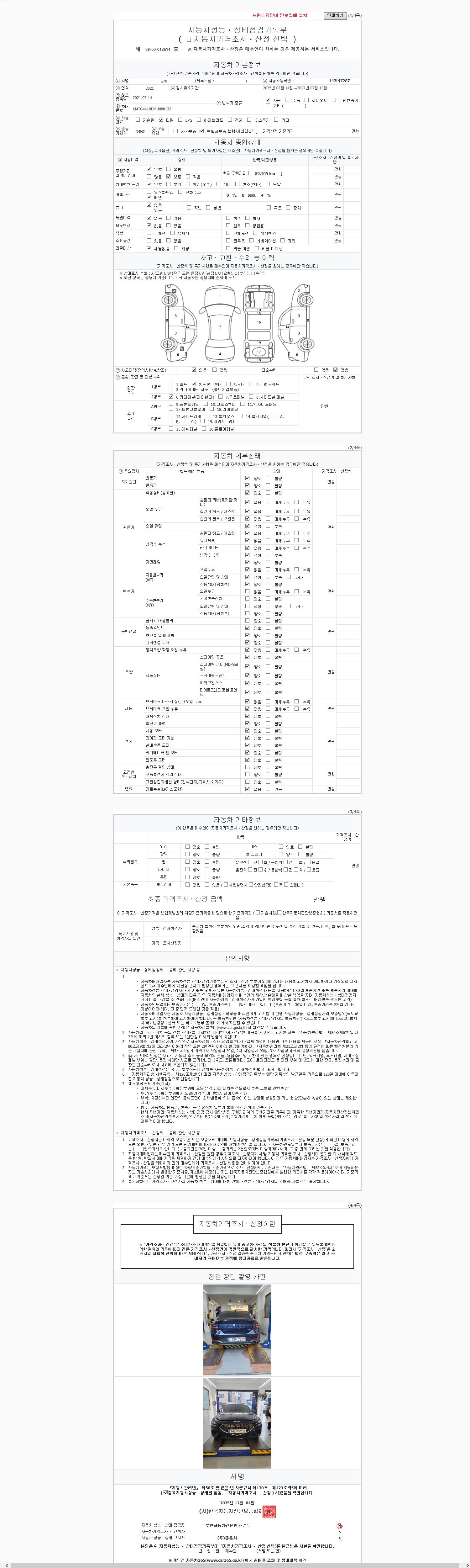 | 주행거리 | 89,000 km | 차량번호 | 142더7287 | 사고유무 | 성능기록부 참조 | 제시번호 | 제 2025228469 호 |