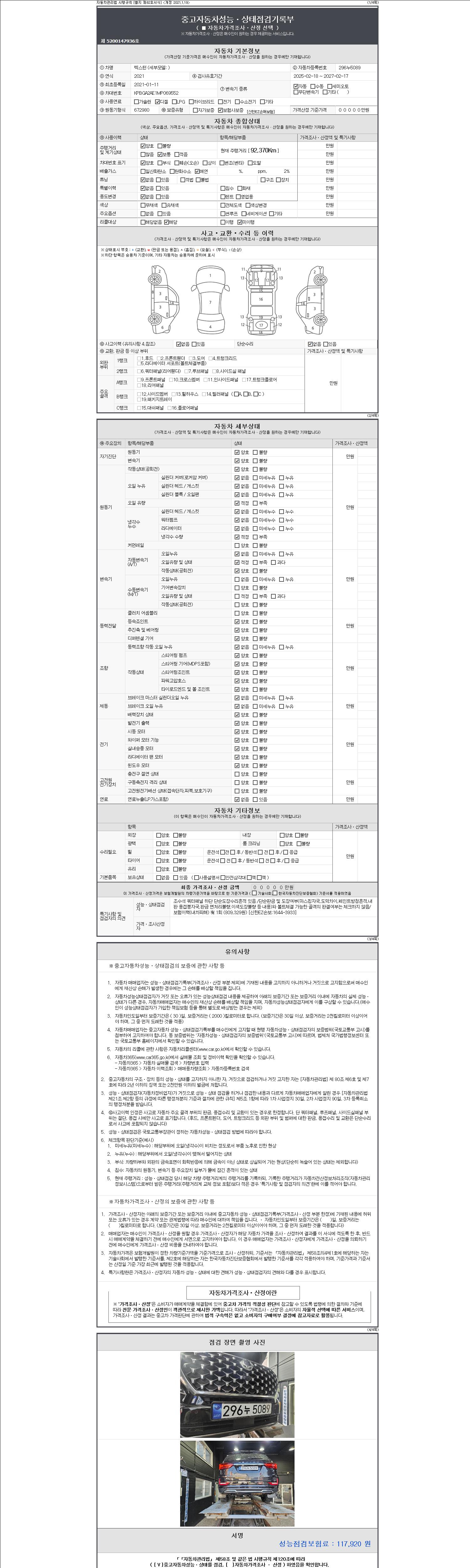| 주행거리 | 92,370 km | 차량번호 | 296누5089 | 사고유무 | 성능기록부 참조 | 제시번호 | 제 2147483647 호 |