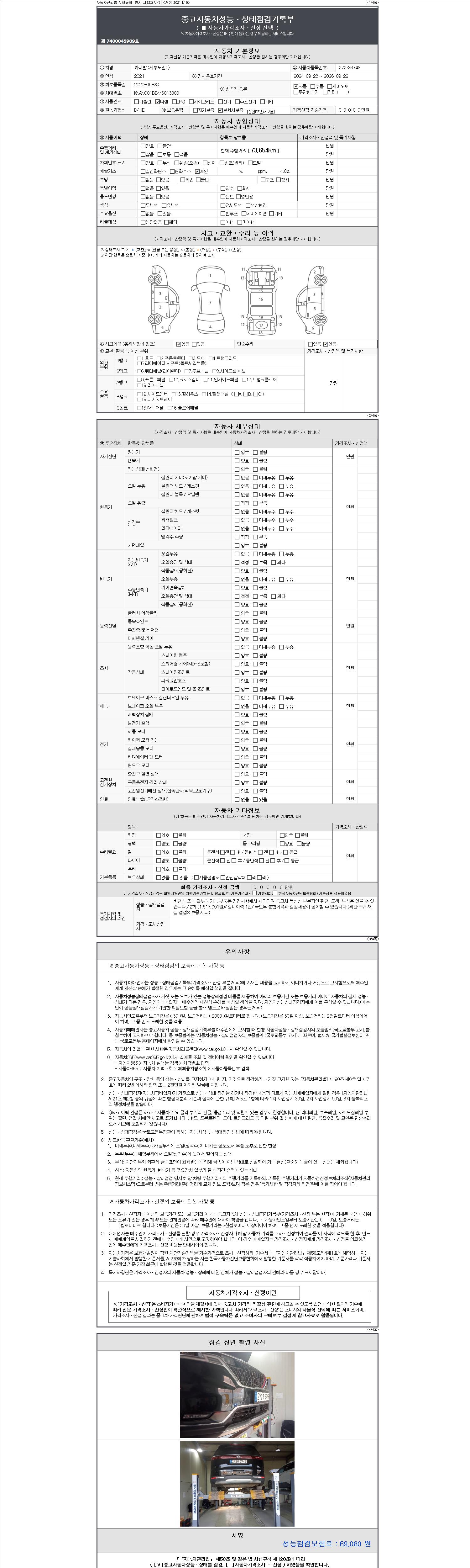 자동차관리법 시행규칙 제120조의 규정에 따라 별지 제 82호서식 《중고자동차 성능, 상태점검 기록부》를 발행한 성능, 상태점검자 및 매매자는 아래의 보증기간 또는 보증거리 이내의 중고자동차, 성능점검 기록부에 기재된 내용과 자동차의 실제 성능, 상태가 다른 경우 계약 또는 관계법령에 따라 매수인에 대하여 책임을 집니다.