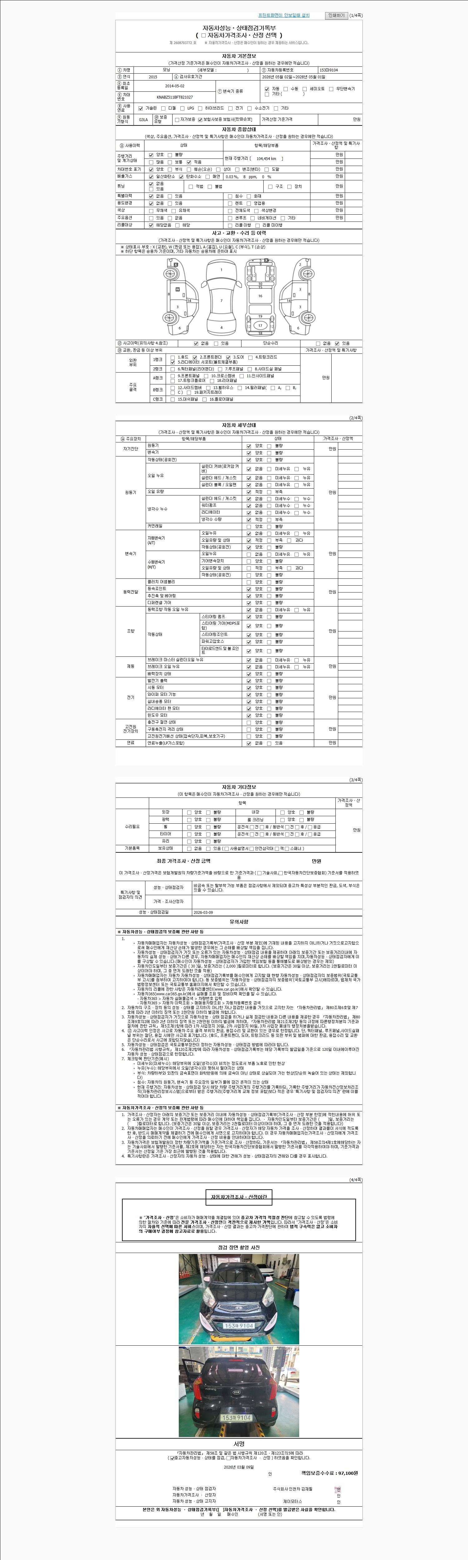 | 주행거리 | 104,454 km | 차량번호 | 153마9104 | 사고유무 | 성능기록부 참조 | 제시번호 | 제 2026012263 호 |