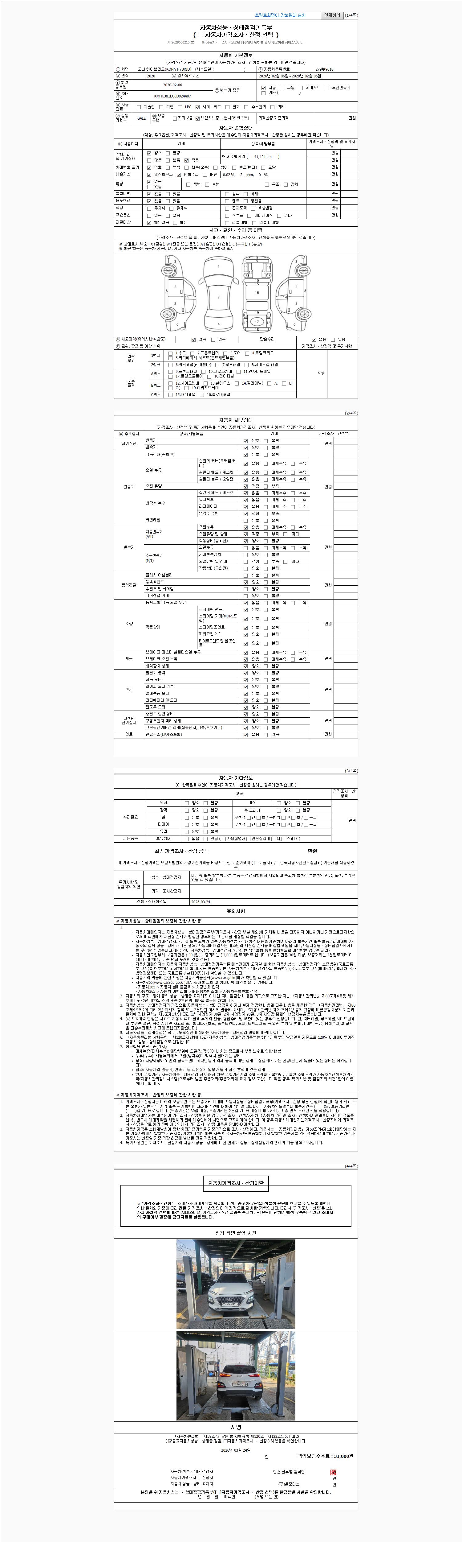 | 주행거리 | 41,434 km | 차량번호 | 279누9018 | 사고유무 | 성능기록부 참조 | 제시번호 | 제 2026015203 호 |
