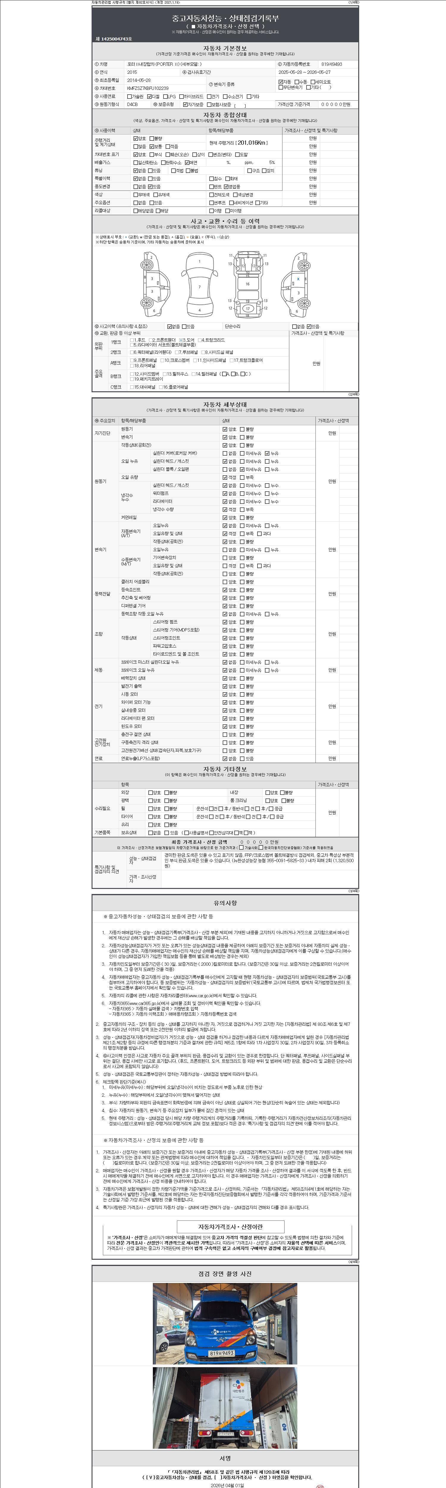 자동차관리법 시행규칙 제120조의 규정에 따라 별지 제 82호서식 《중고자동차 성능, 상태점검 기록부》를 발행한 성능, 상태점검자 및 매매자는 아래의 보증기간 또는 보증거리 이내의 중고자동차, 성능점검 기록부에 기재된 내용과 자동차의 실제 성능, 상태가 다른 경우 계약 또는 관계법령에 따라 매수인에 대하여 책임을 집니다.