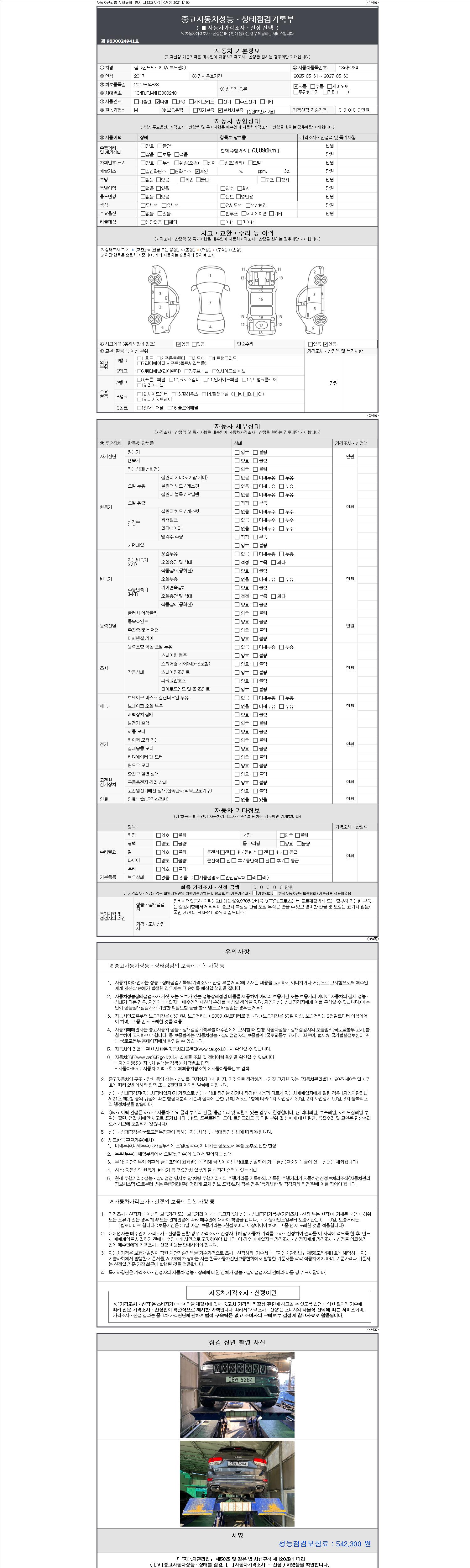 자동차관리법 시행규칙 제120조의 규정에 따라 별지 제 82호서식 《중고자동차 성능, 상태점검 기록부》를 발행한 성능, 상태점검자 및 매매자는 아래의 보증기간 또는 보증거리 이내의 중고자동차, 성능점검 기록부에 기재된 내용과 자동차의 실제 성능, 상태가 다른 경우 계약 또는 관계법령에 따라 매수인에 대하여 책임을 집니다.