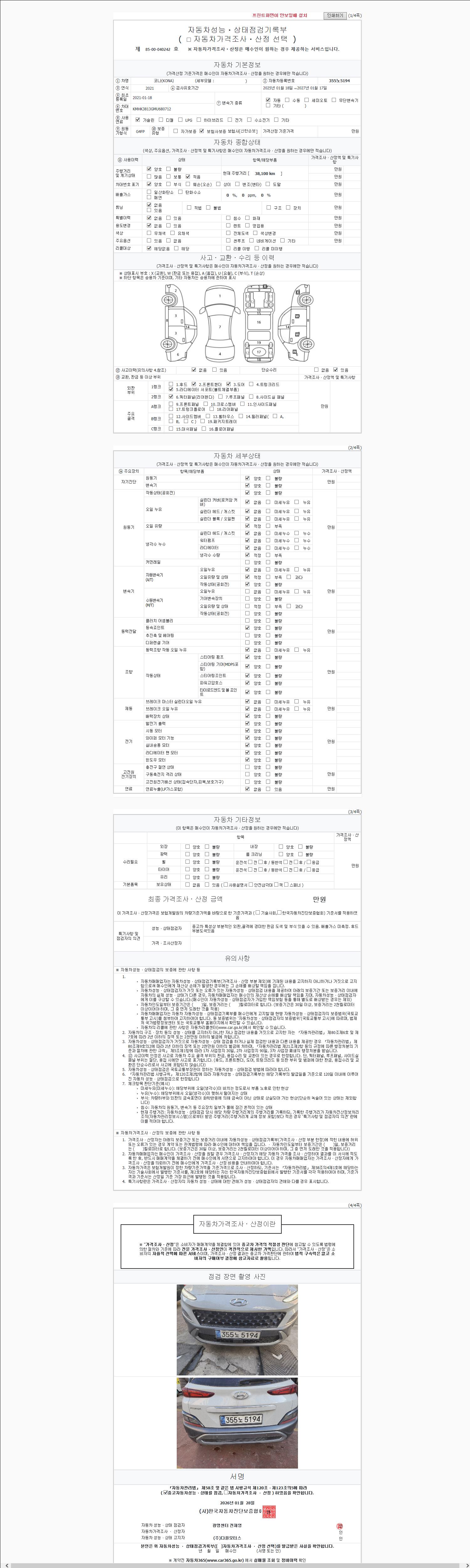 | 주행거리 | 38,101 km | 차량번호 | 355노5194 | 사고유무 | 성능기록부 참조 | 제시번호 | 제 2147483647 호 |