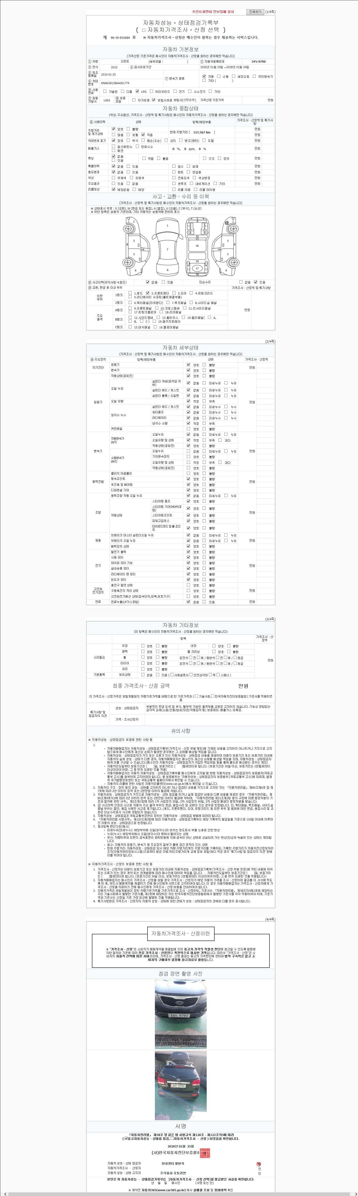 | 주행거리 | 157,567 km | 차량번호 | 34누9790 | 사고유무 | 성능기록부 참조 | 제시번호 | 제 2026024477 호 |