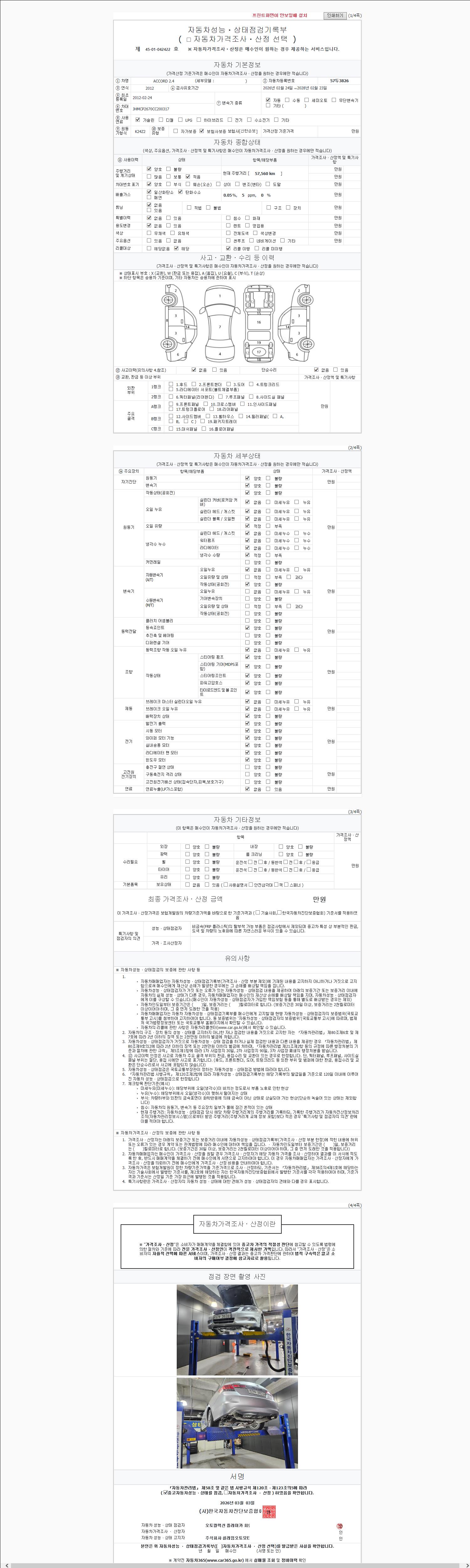| 주행거리 | 57,560 km | 차량번호 | 57두3826 | 사고유무 | 성능기록부 참조 | 제시번호 | 제 2147483647 호 |