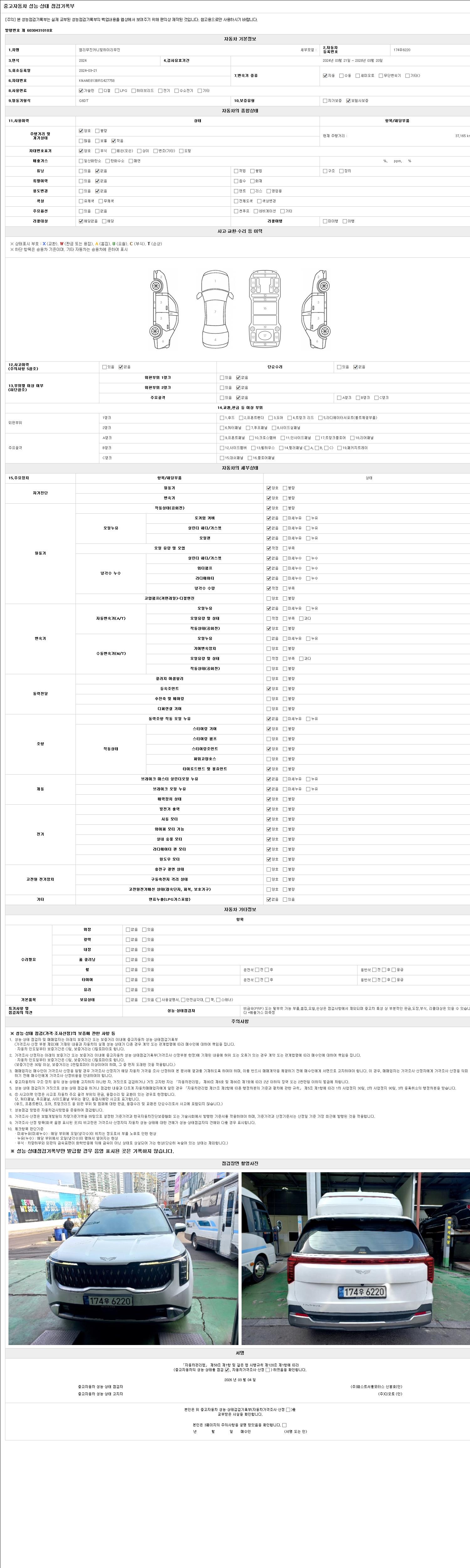 | 주행거리 | 37,000 km | 차량번호 | 174우6220 | 사고유무 | 성능기록부 참조 | 제시번호 | 제 2026006672 호 |