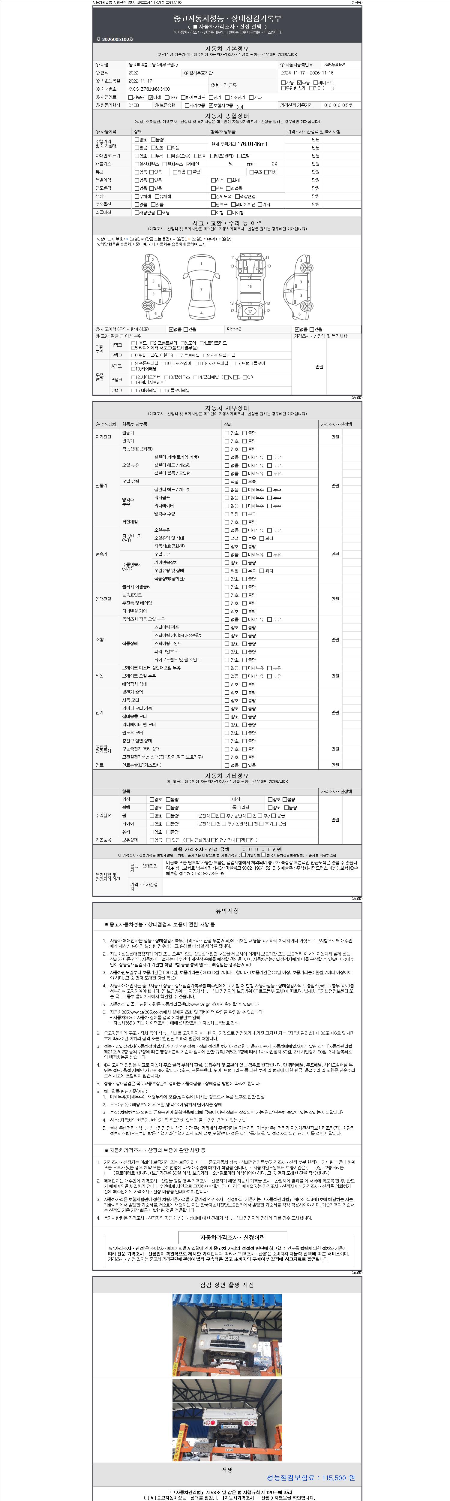 자동차관리법 시행규칙 제120조의 규정에 따라 별지 제 82호서식 《중고자동차 성능, 상태점검 기록부》를 발행한 성능, 상태점검자 및 매매자는 아래의 보증기간 또는 보증거리 이내의 중고자동차, 성능점검 기록부에 기재된 내용과 자동차의 실제 성능, 상태가 다른 경우 계약 또는 관계법령에 따라 매수인에 대하여 책임을 집니다.